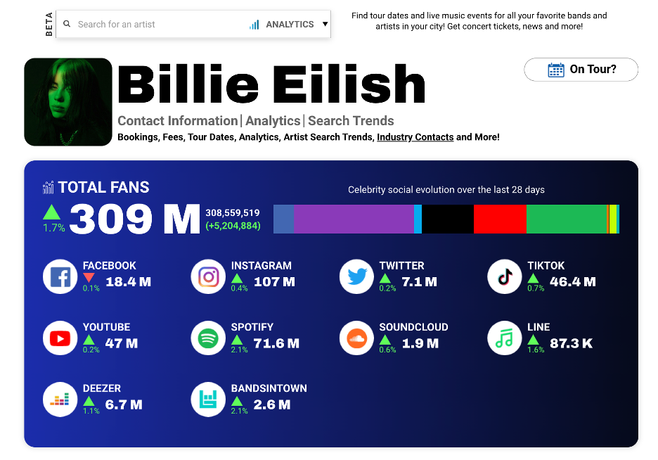 Live music and entertainment industry trade CelebrityAccess has added analytics that includes data from major social and streaming platforms, Bandsintown, Google Search, and other sources.