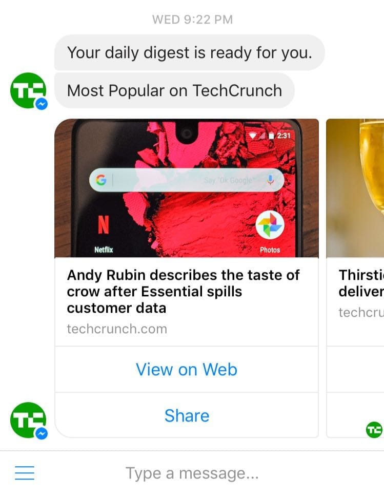 Chatbots with many features and others which request for user information that doesn’t necessarily add to the value and improvement of its’ core functionality turns users off. Let the core functionality of the chatbot do one thing extremely well and one thing only. As an example , I continue to be impressed by Tech Crunch chatbot which provides a daily digest of the most popular stories on Tech Crunch. It only provides the View and Share call to action button as the only necessary features to interact with the bot. This has allowed it to settle and operate subtly in my Messenger application without me feeling inconvenienced and yet keep delivering perfectly well on its core purpose.