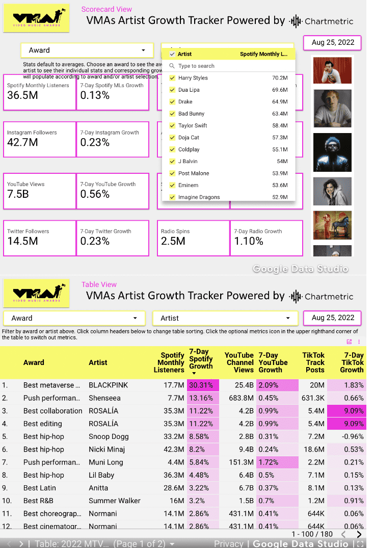 Looking for a list of MTV VMAs awards, nominees, winners, and their stats? Check out the Chartmetric MTV VMAs Artist Growth Tracker dashboard here:
