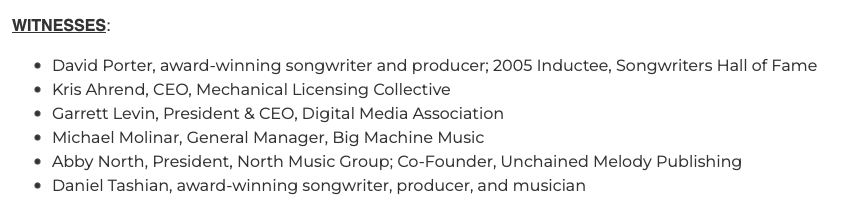 That five year period is actually up next year, so Congress may be getting an early start to identify performance benchmarks for The MLC, Inc. so that the Copyright Office doesn’t have to wing it. If you have some thoughts about what The MLC, Inc. could be doing better or is doing well, you have a chance to write to your representative or even members of the committee before the hearing next week and let them know.