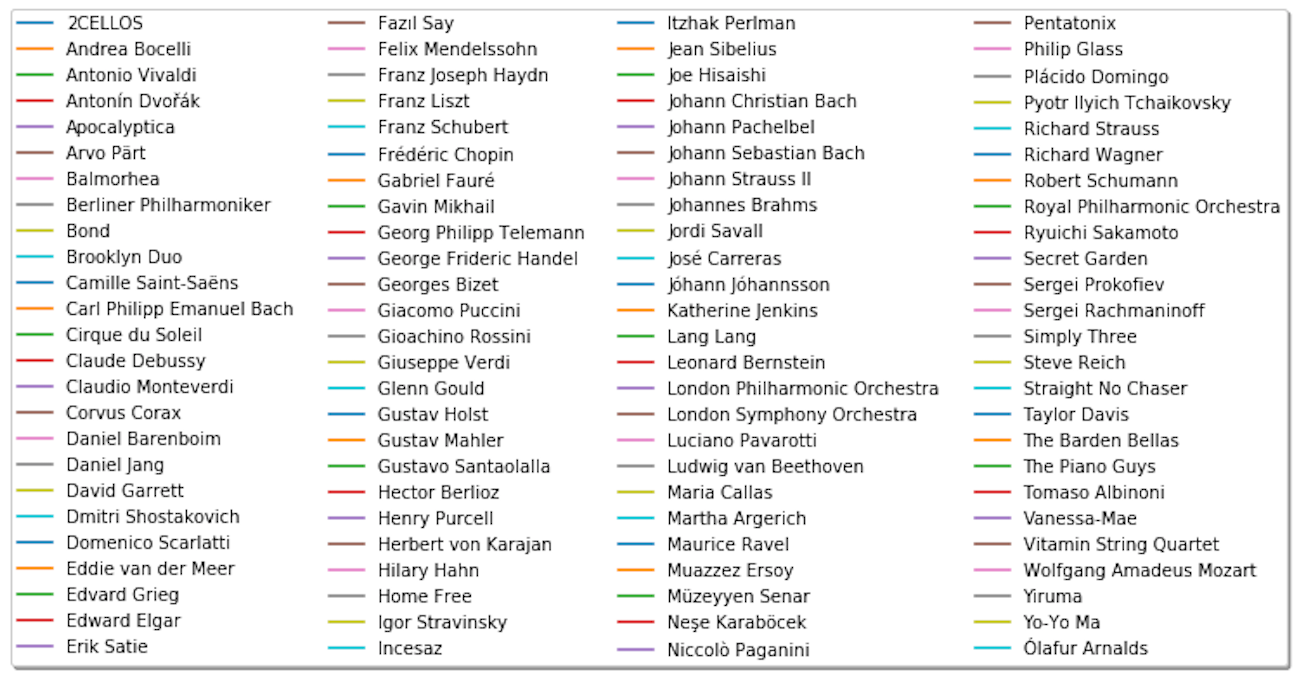 1) Classical, Ensemble & Opera includes romantic era, early modern classical, a cappella
