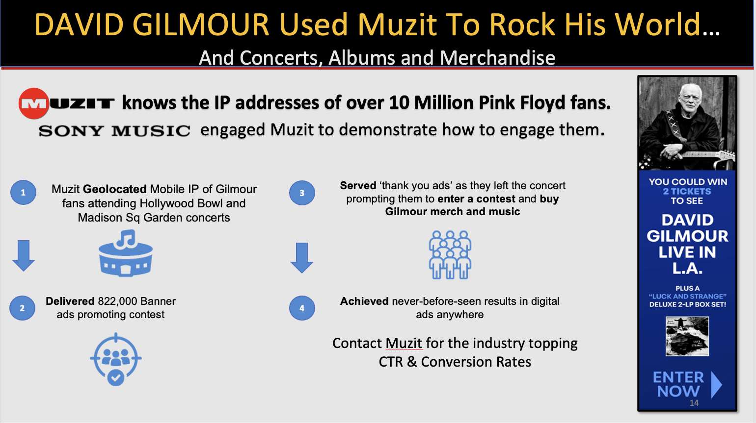 Our most successful campaign to date has been promoting the new release of Sony artist, David Gilmour. David was to perform at The Hollywood Bowl, The Sphere and Madison Square Gardens. Muzit identified 800,000 Pink Floyd fans within 100 miles of these venues and delivered banner ads offering free tickets and exclusive new music and merchandise from TicketMaster and Sony.