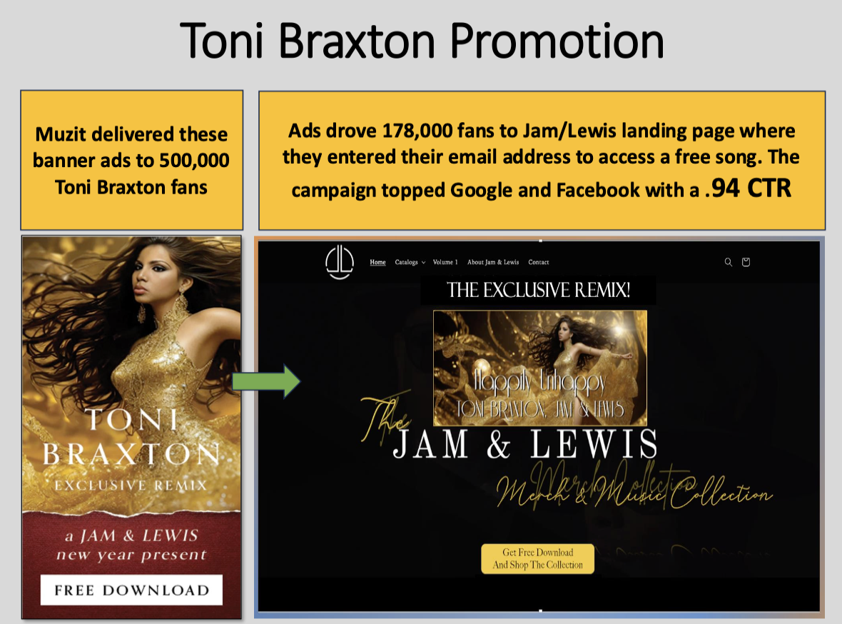 Hall Of Fame Songwriters Jimmy Jam & Terry Lewis used Muzit to promote their new single featuring Toni Braxton. Muzit selected 500,000 Toni Braxton fans from our TRACE database of over 850 Million IP addresses. Rather than issuing takedowns or a lawsuit, we sent banner ads to them all offering a free download - yes I said it - of the new Jimmy Jam and Terry Lewis single featuring Braxton.
