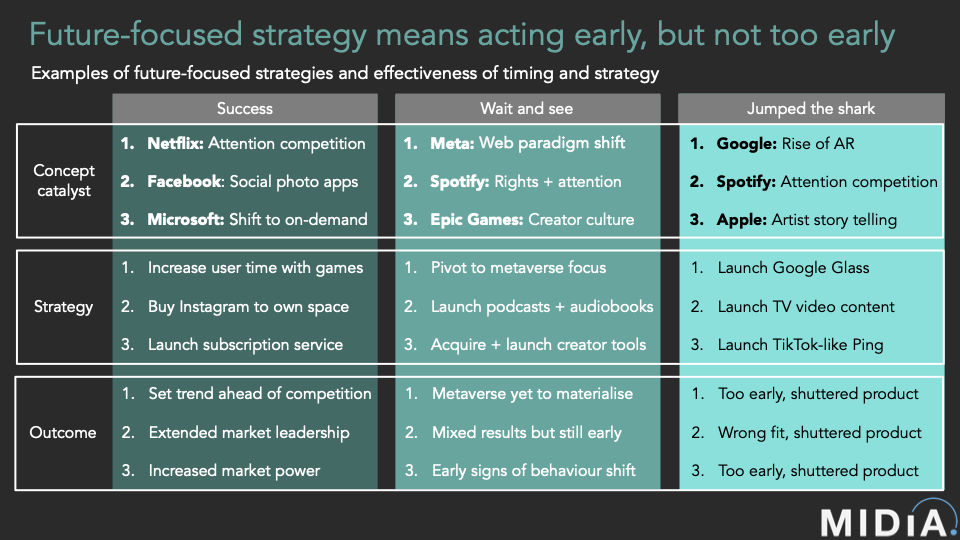 If you would like to learn more about MIDiA’s approach to future focused strategy, how our consulting team can help you build one or would like to learn more about our future focused strategy report then email businessdevelopment@midiaresearch.com