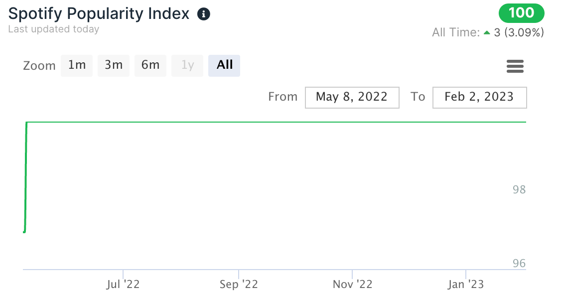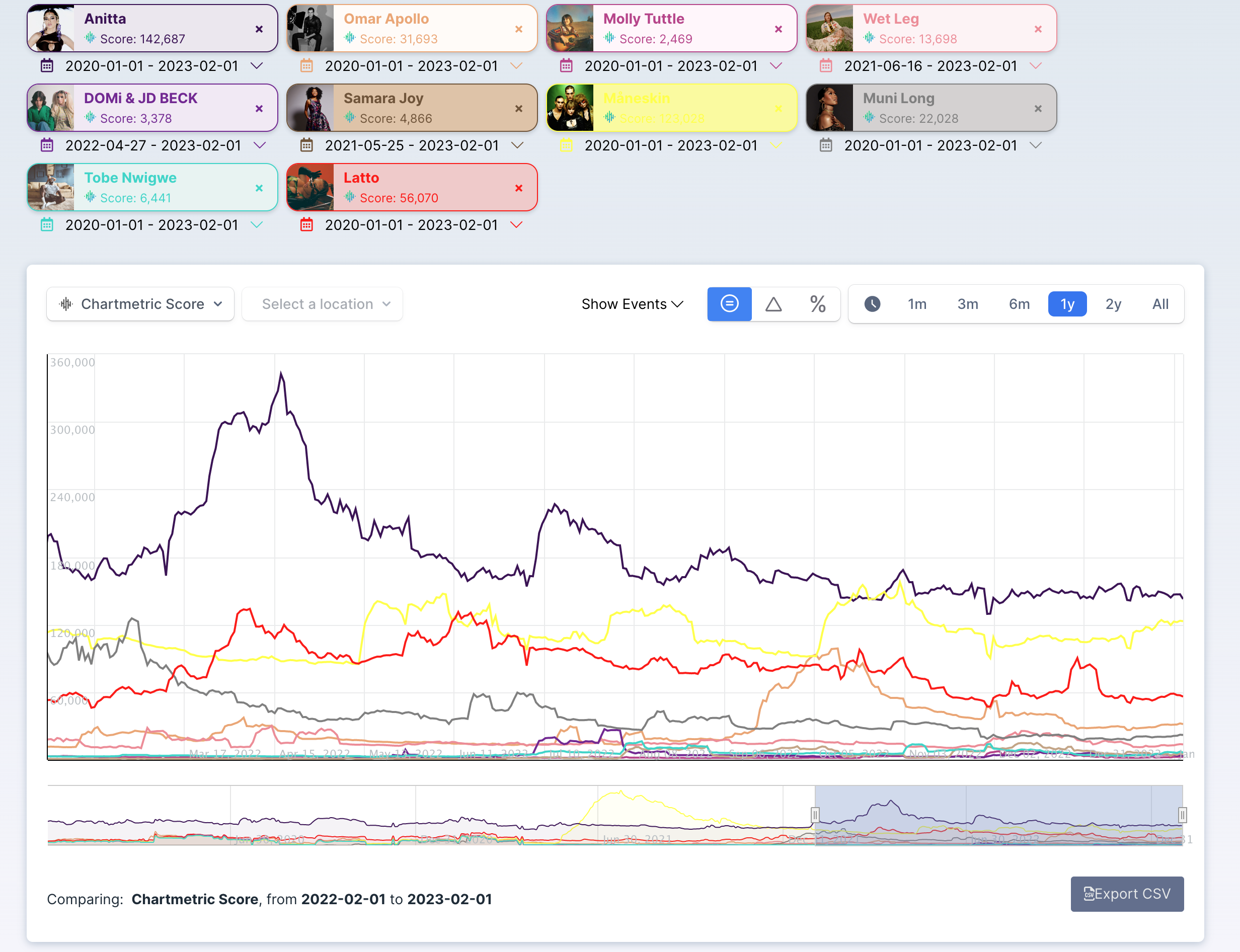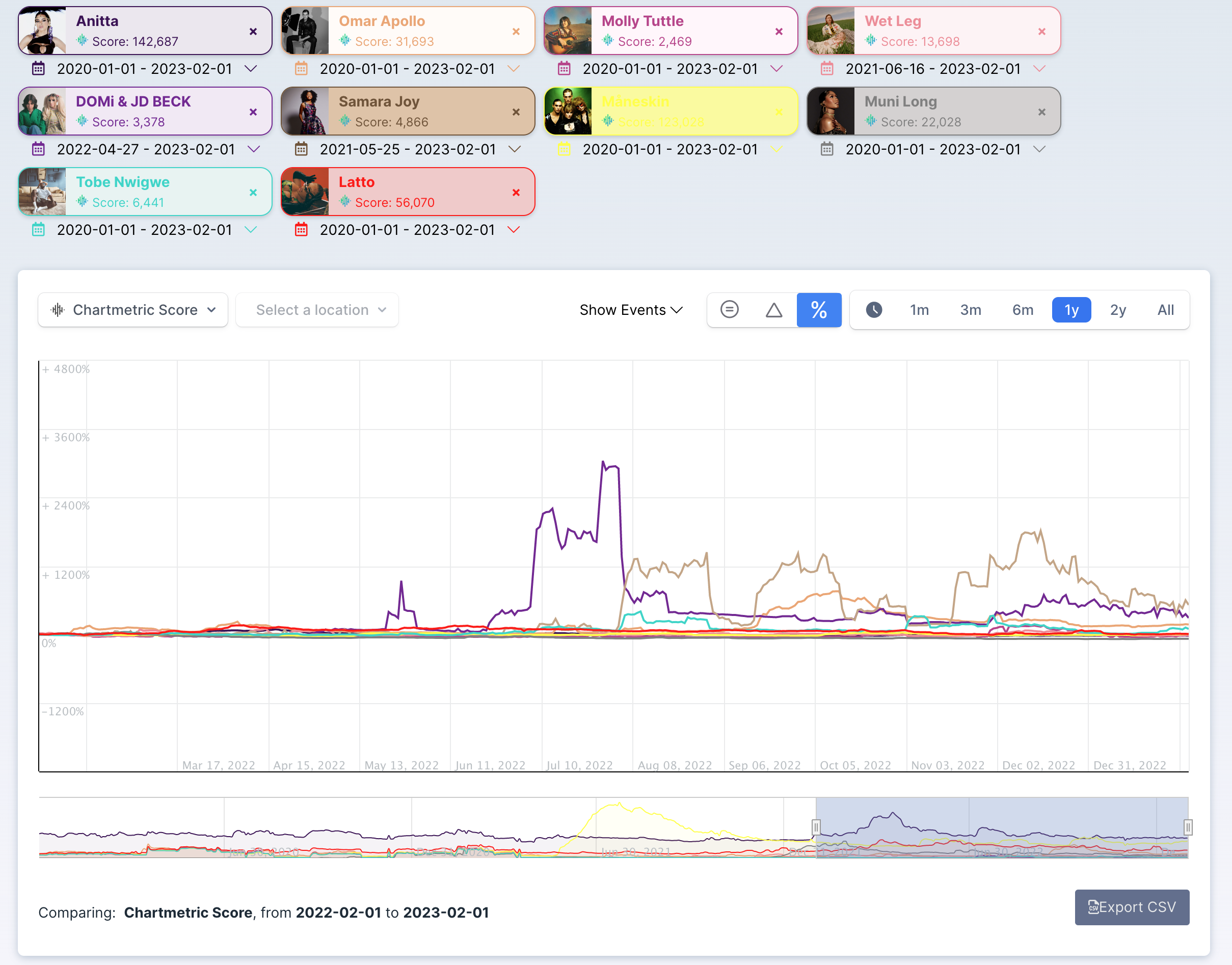 Using our Artist comparison tool, Brazilian Latin Pop artist Anitta appears to be the clear consideration for first place. Thanks to a viral TikTok challenge for her track “Envolver,” she quickly became the first Latin woman to reach No. 1 on Spotify’s global chart in March, peaking with a Chartmetric Artist Score of 342.4K. However, over the course of the year, Anitta actually saw her artist score fall 55.8K points. Muni Long, Wet Leg, and Molly Tuttle also saw decreases in their overall Chartmetric Artist Score throughout 2022. Omar Apollo, on the other hand, saw his score increase from 11.5K to 31.6K over the course of the year, making him the top growing nominee across all platforms.