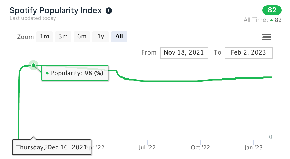 With fans gearing up to see whether or not history will repeat itself, the data certainly tell an interesting story about how both 30 and RENAISSANCE performed throughout 2022. Following its release, Adele’s 30 reached a near-perfect Spotify Popularity score of 98 and tapered down until falling into the 80s in June. RENAISSANCE, meanwhile, debuted at a lower score of 87, but it’s maintained a higher, more consistent rate post-release.