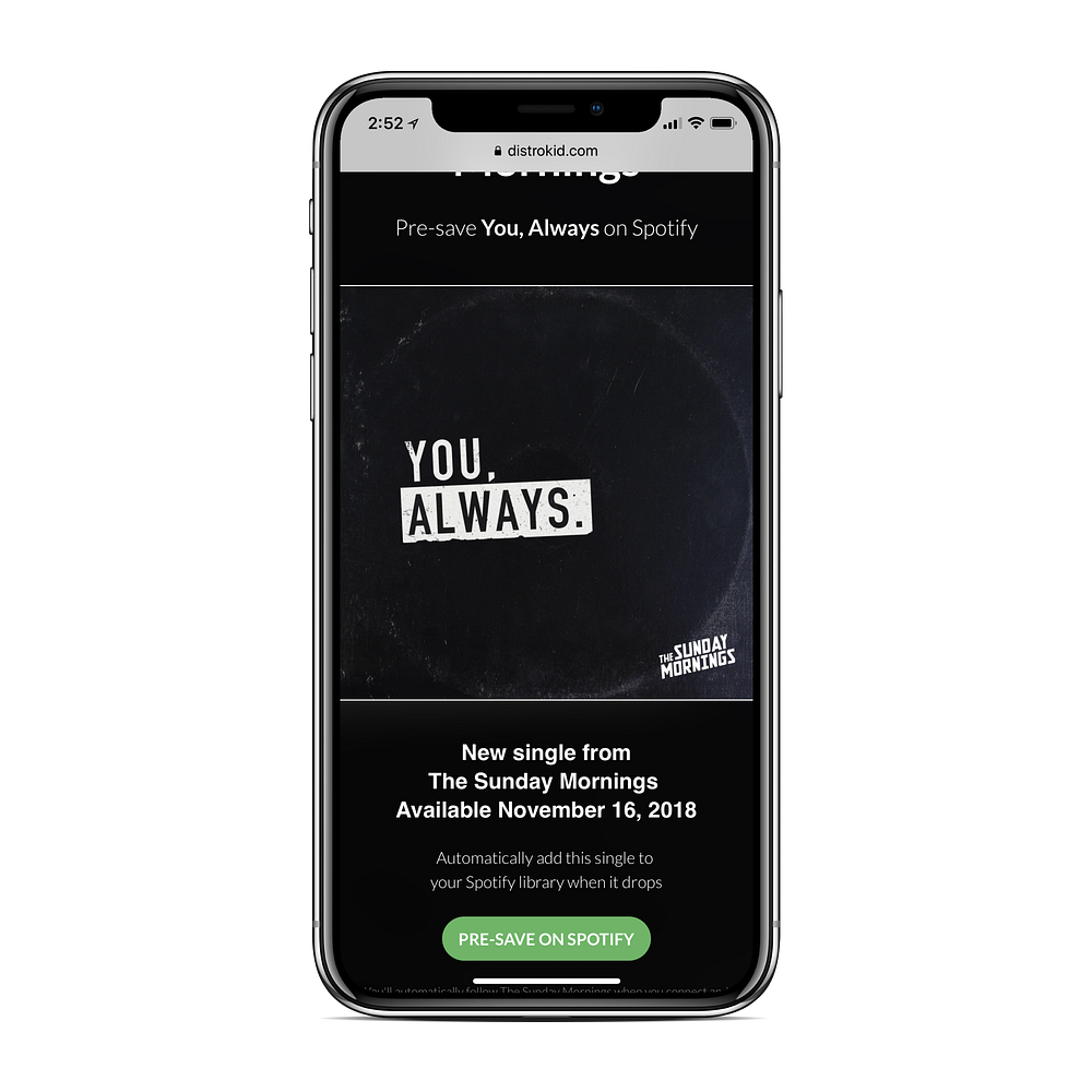 HyperFollow pre-save for album that’s not yet released. Example here.Fans can click the button any time — even before your album drops. DistroKid will then detect the moment your album goes live. And will automatically add all your new followers (and saves) on your release date. We’ll also email those followers & let them know they can start listening.You don’t have to think about it or do anything.HyperFollow is free for all DistroKid members. It’s available today, and supports all DistroKid releases — even old tracks.To get started: