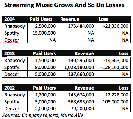 Rhapsody’s losses are a drop in the bucket when compared to Spotify. In 2013 the company reported operating losses of $128 million. While the company didn’t report subscribers, it has been suggested the company had around nine million paying subscribers at the end of 2013, leading to a $14 loss per sub in that year.