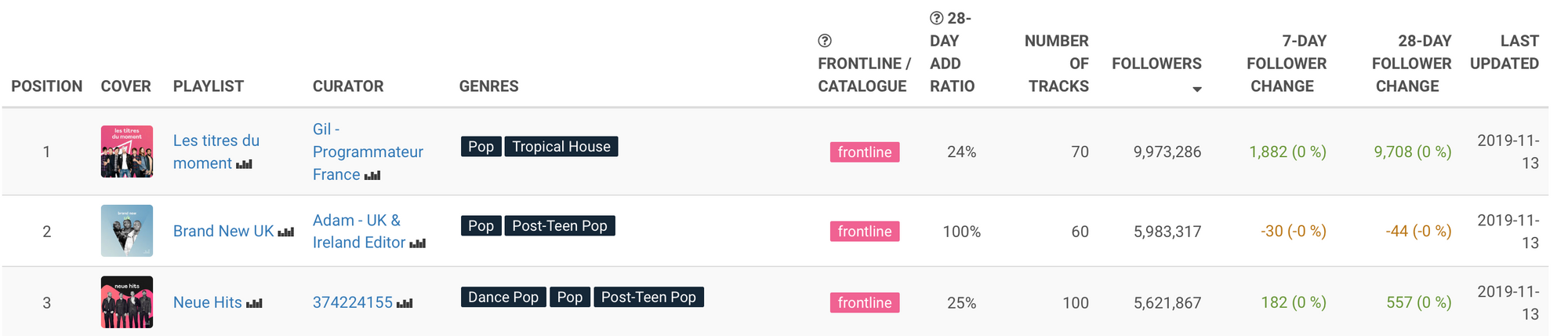 On Deezer, Les Titres Du Moment, Brand New UK, and Neue Hits comprise the cream of the crop when it comes to follower count, and each of those varies quite a bit in terms of track count: 70, 60, and 100, respectively. Meanwhile, Amazon’s Top 3, according to display order, are Country Heat, All Hits, and Pop Culture, each of which maintains 50 tracks, just like Spotify’s.