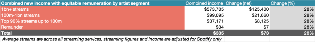 The one billion-plus-streams artists would earn an extra $125,400 a year from Spotify (around $350,000 across all services), but further down the ladder the pickings are more meagre. The 98% of Spotify’s 43K club that currently earn $29,046 would get an extra $8,125 (around $21,000 across all services). A meaningful amount, but unless you are a solo act probably not enough to transform streaming into a liveable income source. And don’t forget, we are still talking about the very top echelon of artists here; for the remaining 99% of artists the average additional income from ER would be $7 a year (though again, the distribution would not be linear, so some will earn in the hundreds and some in the low thousands).