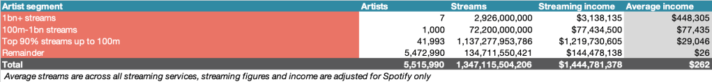 To illustrate the point, we can slice this 43,000 a few ways thanks to a number of industry figures. In his DCMS presentation, WMG’s Tony Harlow stated that the label had eight artists globally that had a billion streams. Assuming that is a ‘lifetime’ rather than annual figure and applying market share assumptions, that gives us around seven artists across all labels generating a billion streams a year. Additionally, the BPI recently reported that 200 artists generated more than 100 million streams each in the UK in 2020. Taking these figures into account, applying assumptions to account for global figures and Spotify market shares and then factoring in per-stream rates and the total number of releasing artists globally, we end up with the following: