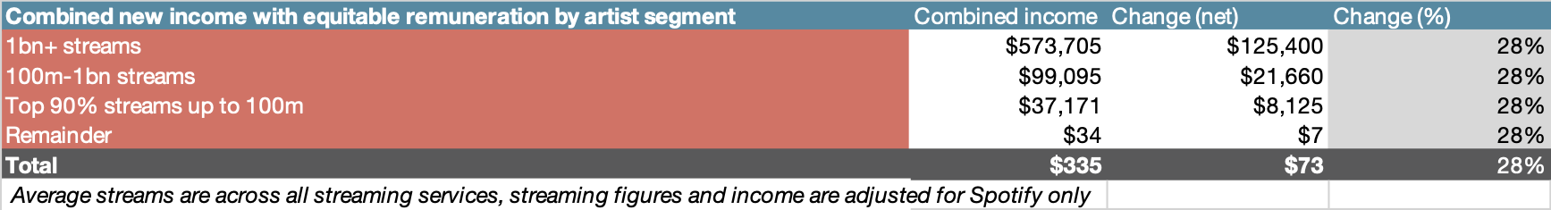 The one billion-plus-streams artists would earn an extra $125,400 a year from Spotify (around $350,000 across all services), but further down the ladder the pickings are more meagre. The 98% of Spotify’s 43K club that currently earn $29,046 would get an extra $8,125 (around $21,000 across all services). A meaningful amount, but unless you are a solo act probably not enough to transform streaming into a liveable income source. And don’t forget, we are still talking about the very top echelon of artists here; for the remaining 99% of artists the average additional income from ER would be $7 a year (though again, the distribution would not be linear, so some will earn in the hundreds and some in the low thousands).