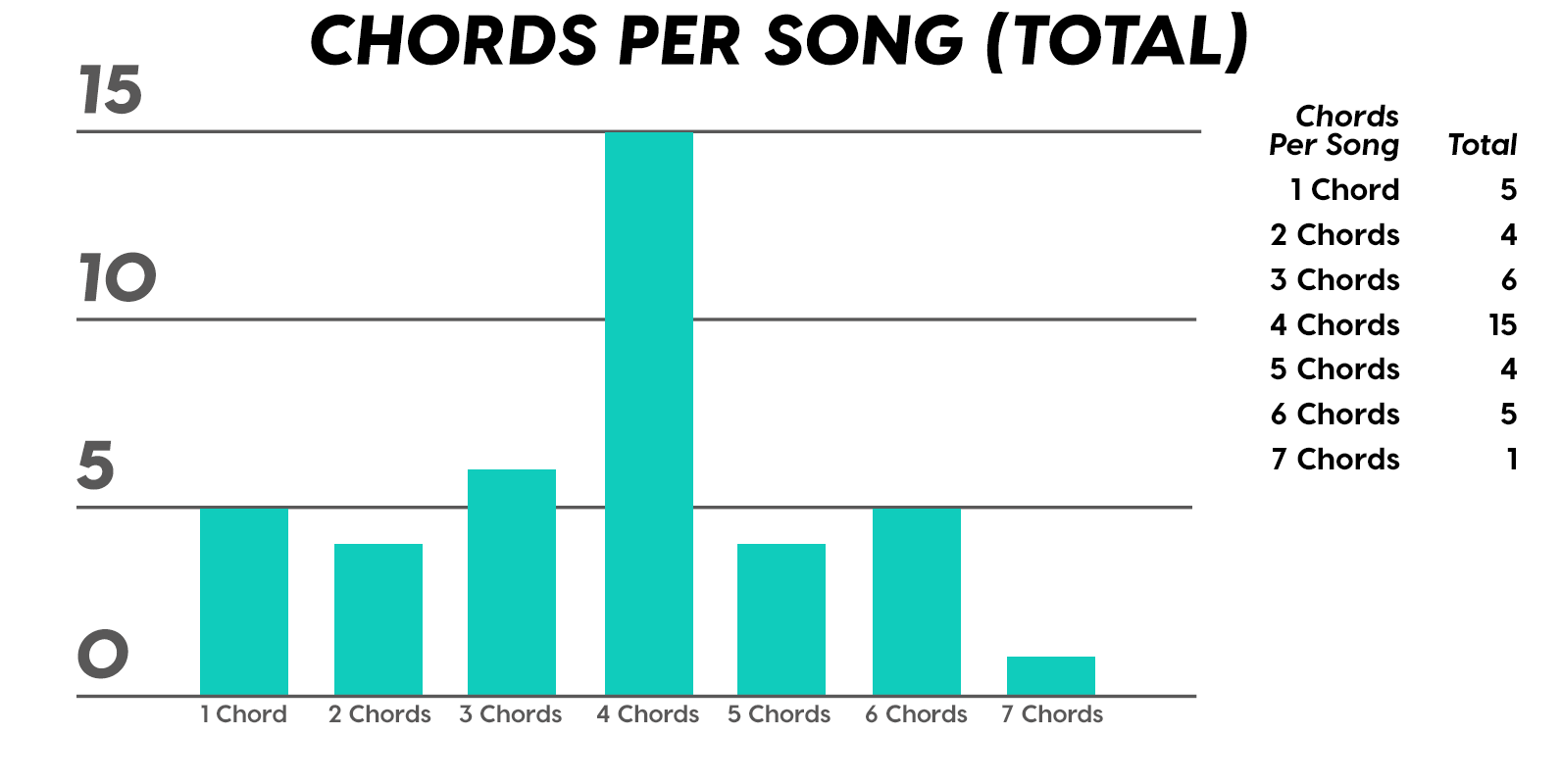 Newsflash: the 4-chord song still reigneth supreme! Meanwhile, 1-chord and 6-chord songs slightly outdid 2-chord and 5-chord songs, which is sort of interesting if you think about it. Disclaimer: the 7-chord song in this study blipped its way in by being the only song to modulate to another tonality. Hey… is it just me, or does anyone else feel like this chart is flipping me off?