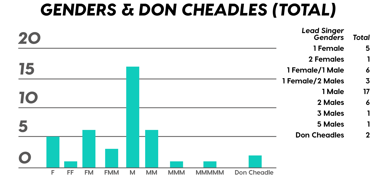 Now, this breakdown is a beast; remember it’s a year’s worth of radio hits. First up, we present the data charts themselves: nine humble music theory analyses of everything from tonalities, keys, and lead singer genders, to total number of appearances of Don Cheadle. Then after that (below), you can find individualized what’s-whats for all of your favorite songs. Enjoy!