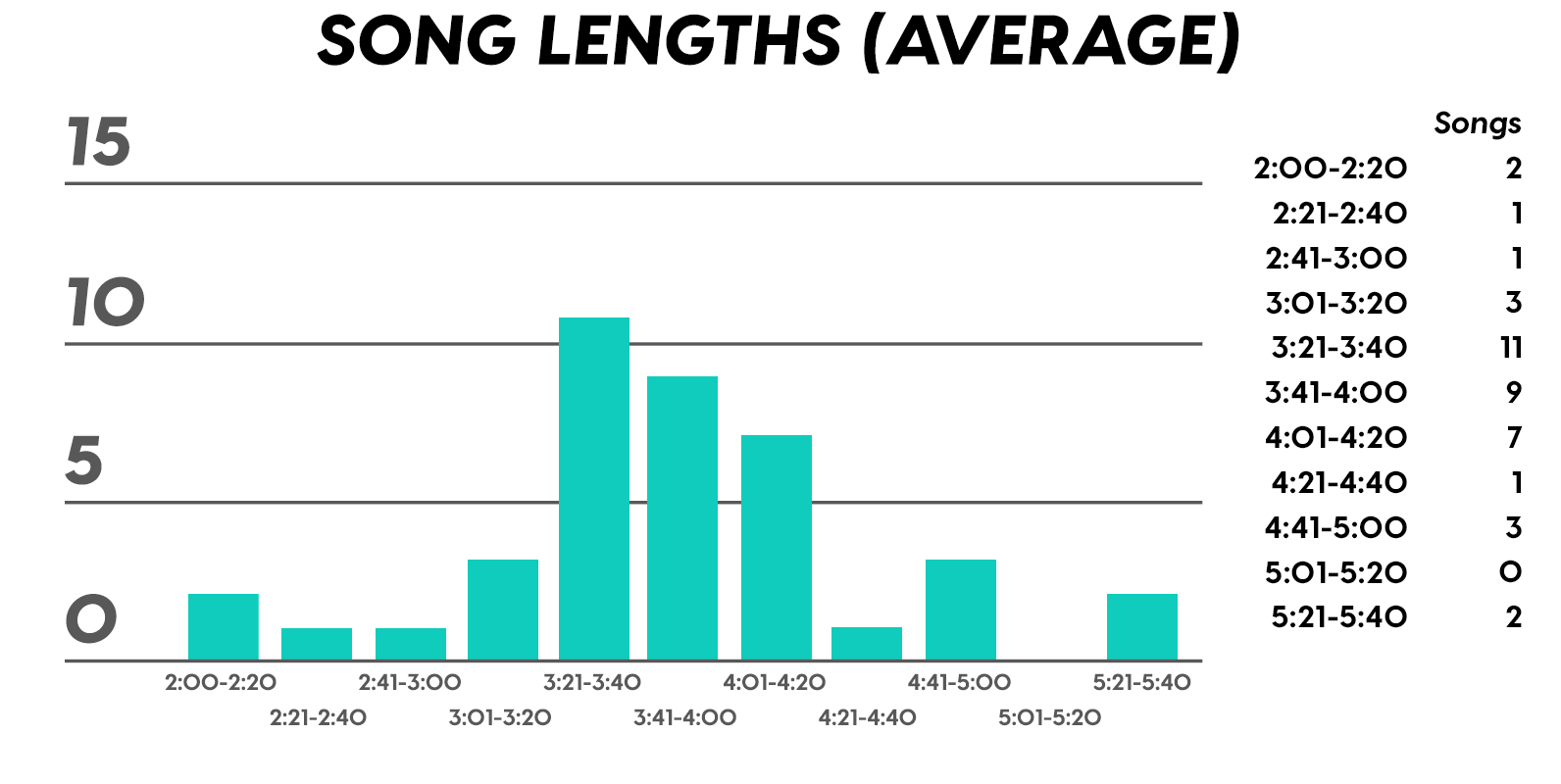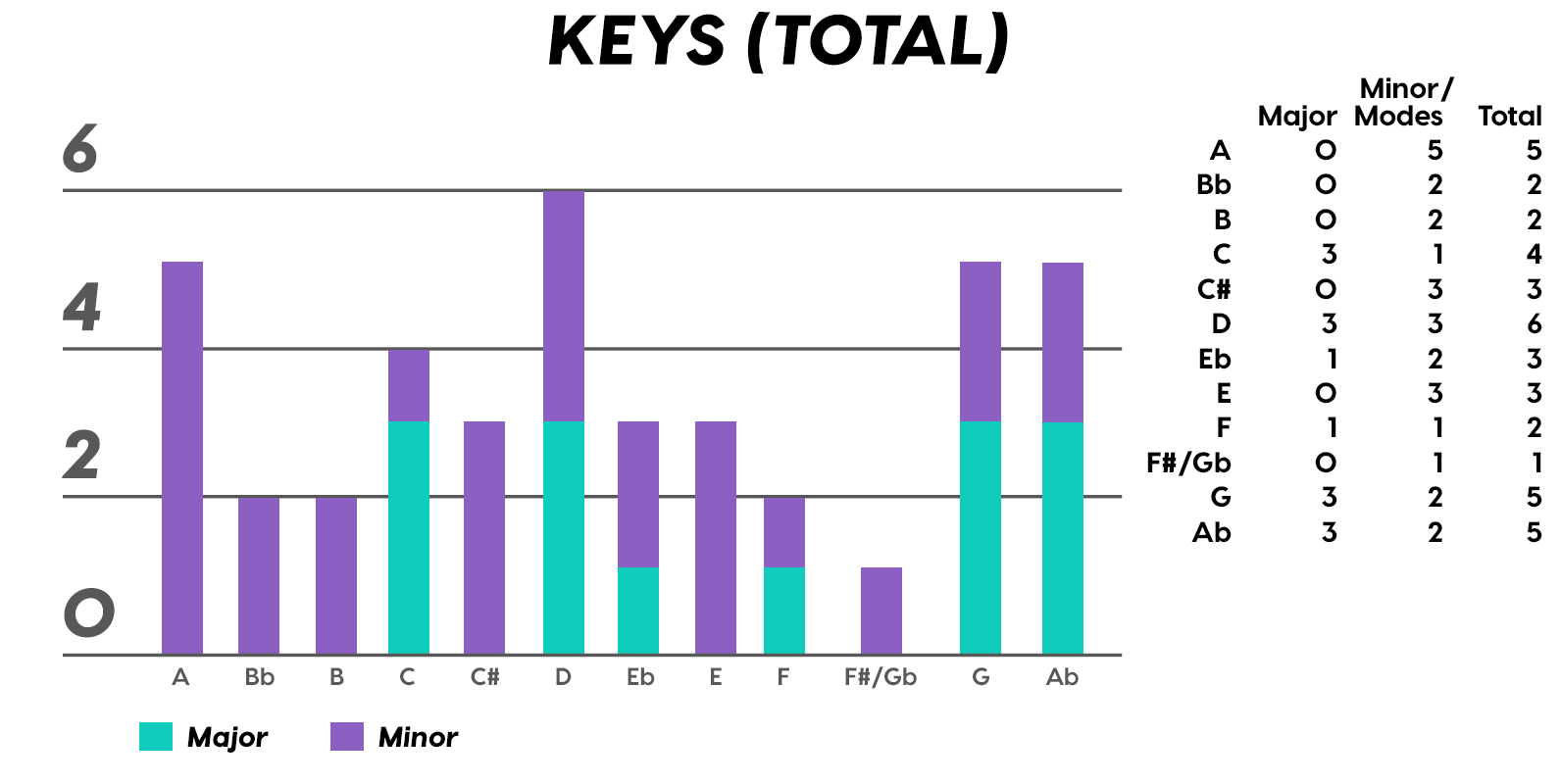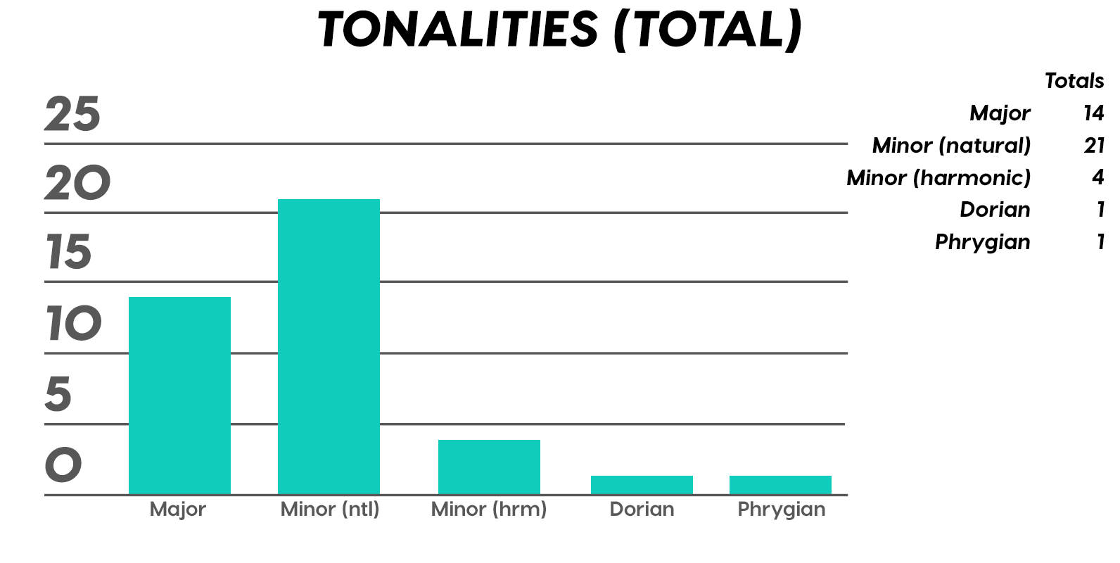 Again, there were so many minor tonalities, we had to split them up. Natural Minor (a.k.a., Aeolian) tallies it way up to win the day, and good old Major holds its humble berth, as expected. Then Harmonic Minor, which is the tonality where you throw in the leading tone (raised 7th scale degree) for functionally delicious V chords. And then the space odyssey minor modes of Dorian and Phrygian for dessert. Seriously guys, good job on making the Top 40, I can’t remember if I’ve seen you here since like, The Doors.