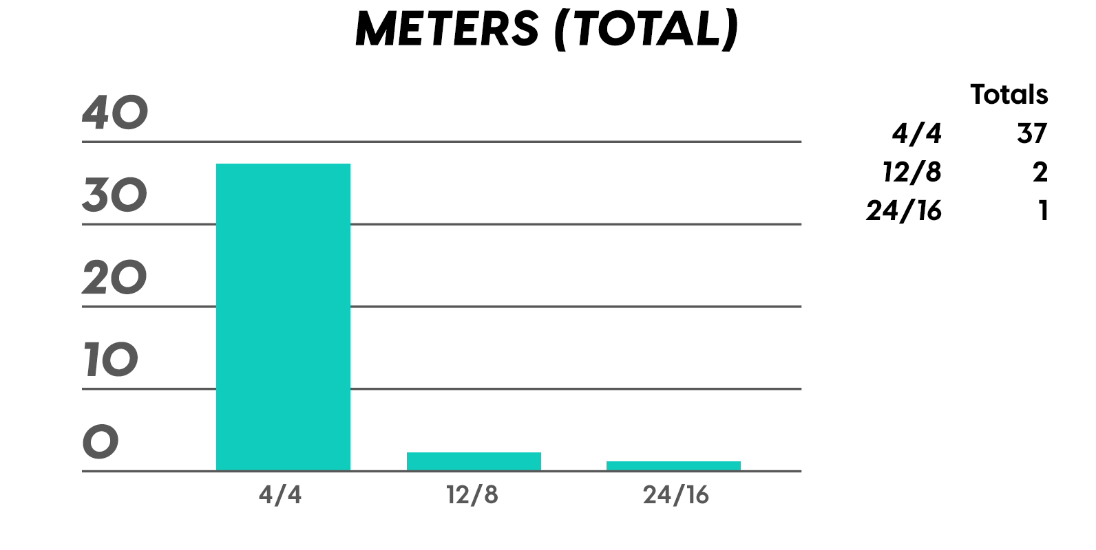 Here you can see exactly why 4/4 is referred to as “common” time. Other than that we just have a few compound meters, including a 24/16, courtesy of some sexy sextuplets imagined by some dragons. Cut time, 2/4, and 3/4 have all been banished until hipsters bring back polkas and waltzes once moustaches and mini butter-churners have run their course.