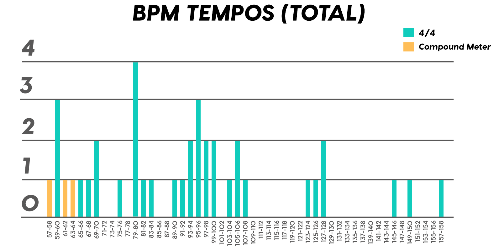 First thing we noticed was, when venturing into triplets land, it’s best to keep that tempo slow (unless you’re in one of those 17-year-cicada-cycles where swing music is in again). Next we got some high action around 80 BPM, our winning tempo of the year. Moving on, a nice healthy critical mass occurred between 90 and 108 BPM, then a tuft from 123-128, and finally, way off to the right, some jams for your Jazzercise class in the 140-150s.
