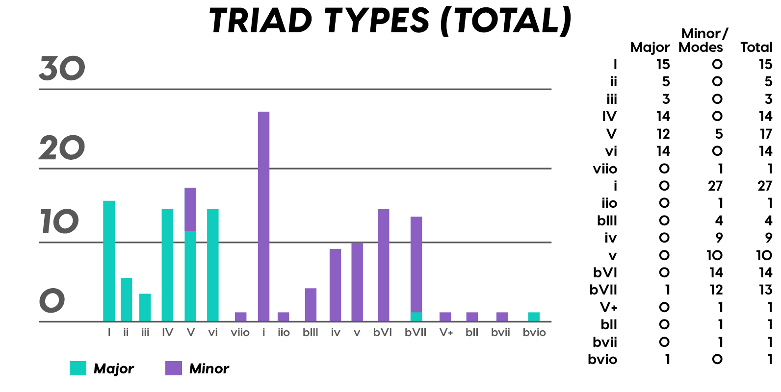 Here’s a chart of Chord-Triad-Type-Appearance Totals, ordered by Major diatonics, then Minor diatonics (chords using notes from the scale and tonality), and then, a few rare animals known as Augmented, Borrowed (a.k.a., Modal Mixture), and Secondary Chords.