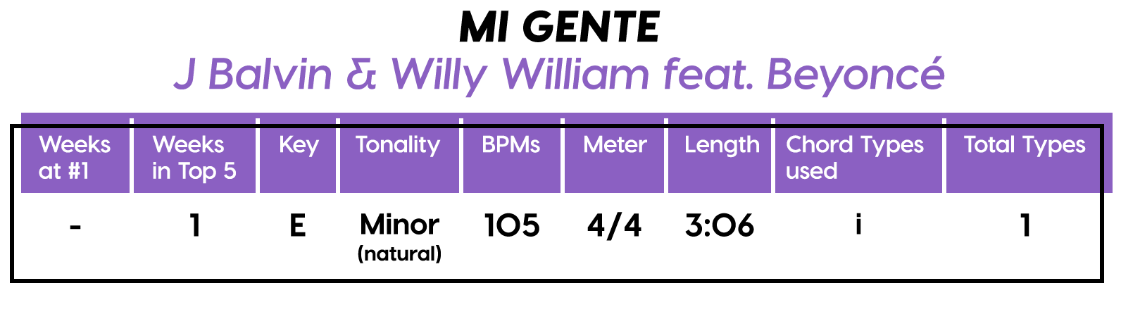 Like most of the songs out there unbound by chord changes, describing the form in traditional terms in “Mi Gente” is tricky. Without much harmony, there’s a lot more room to make each section its own thing, so that’s usually what happens. There’s a clear Hook with the title in it, but other than that, all sections take their own liberties with the melody, lyrics, and number of measures.