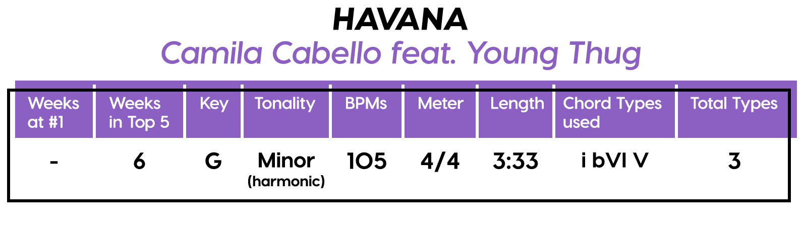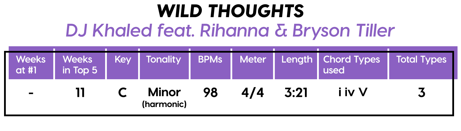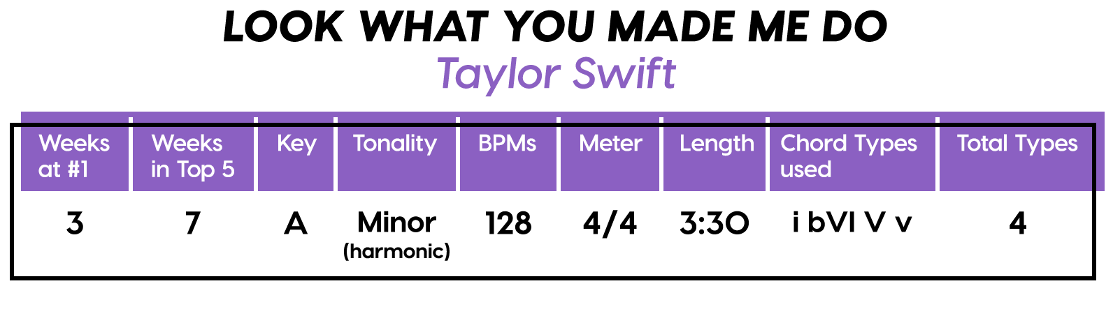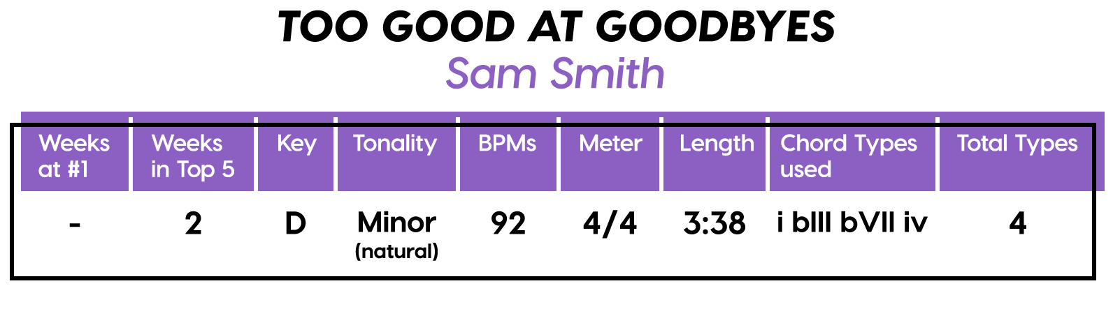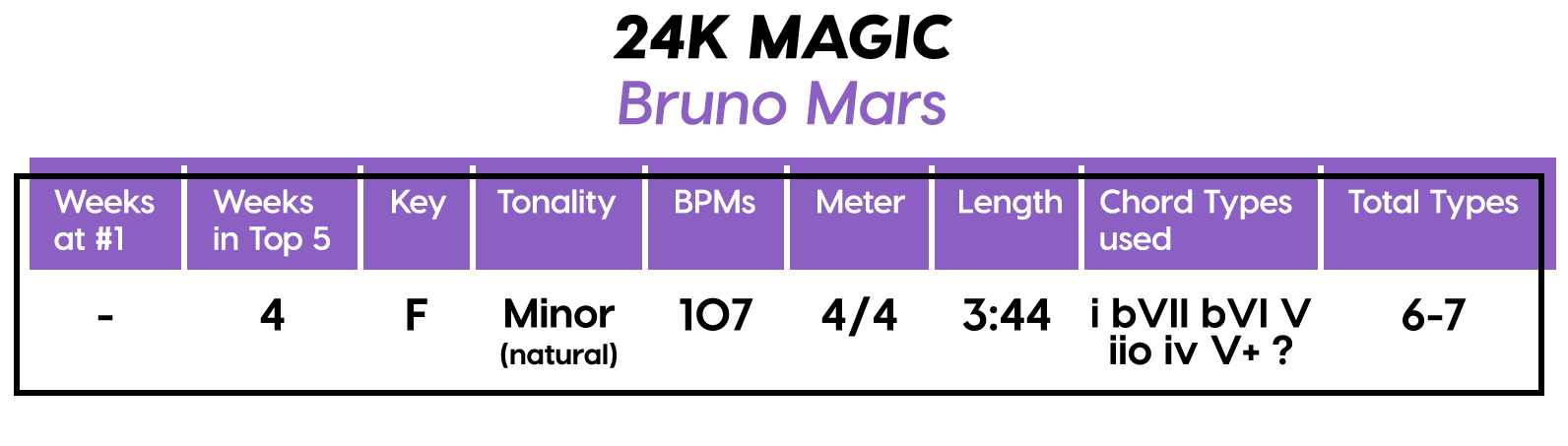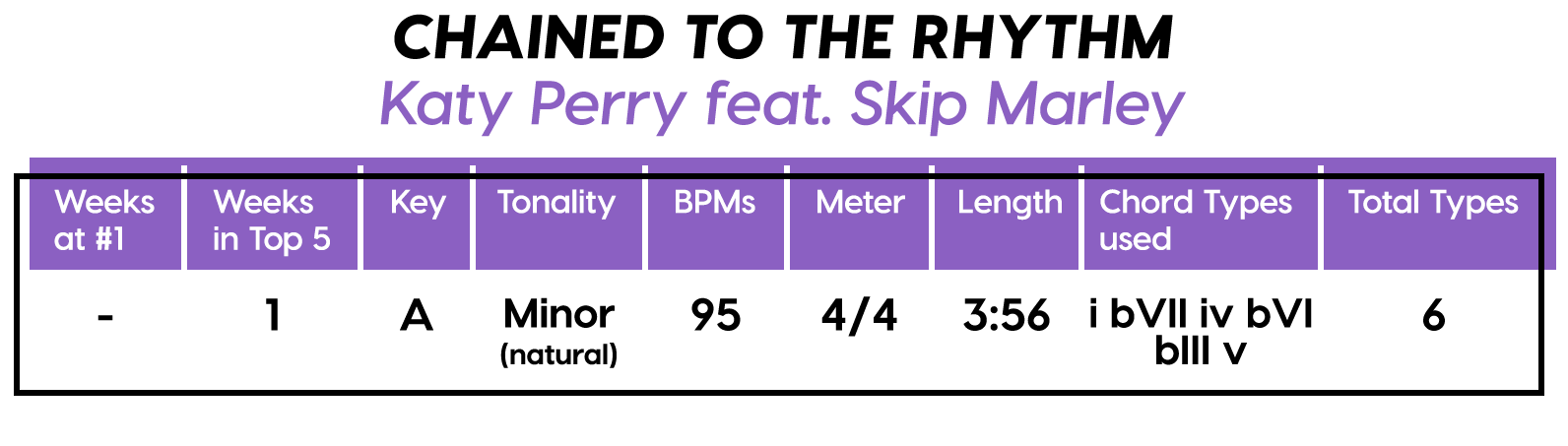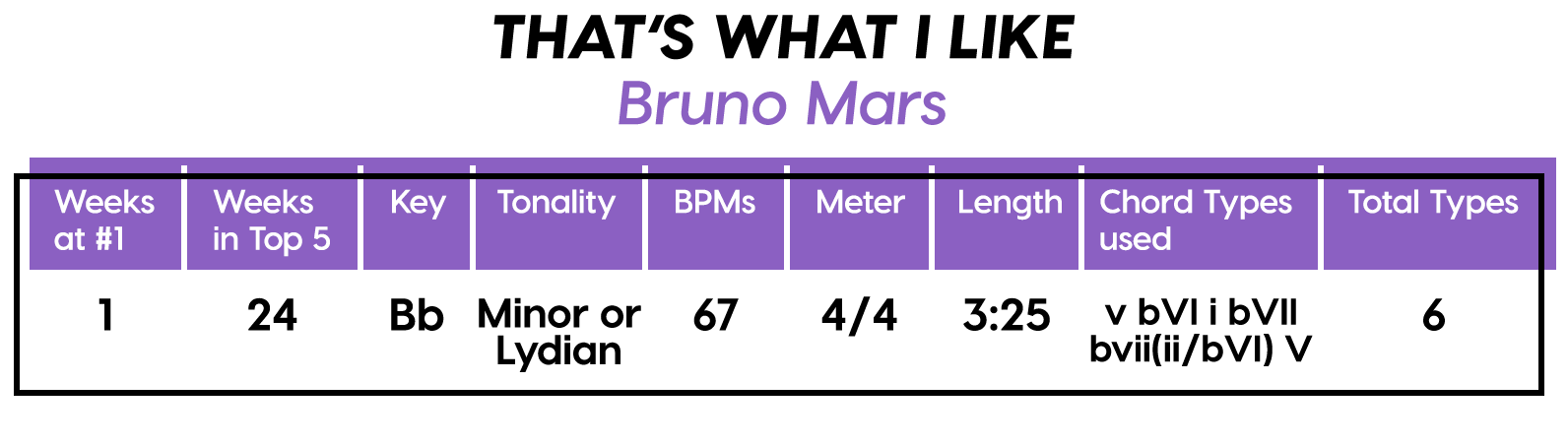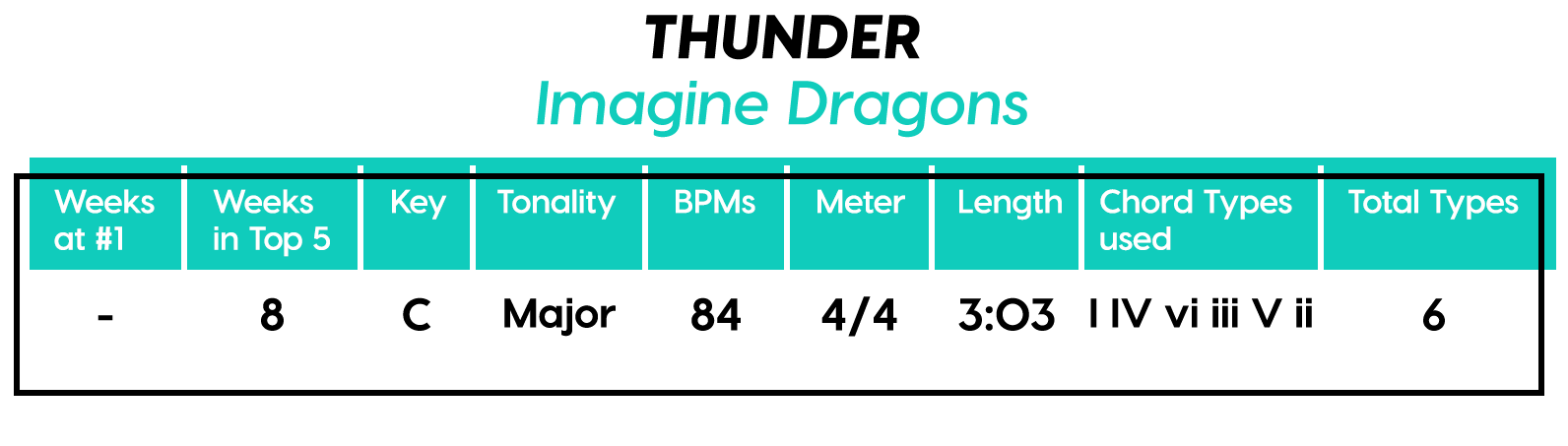 And the Diatonics Award goes to: “Thunder” by Imagine Dragons — all six (main) major diatonics! (we don’t talk about “vii°” anymore, not since he was tragically eaten by “V7”) Every Chorus is a little different, so that’s cool too. The Bridge is really an Instrumental, but I’m still calling it a Bridge because of the new harmonic material.