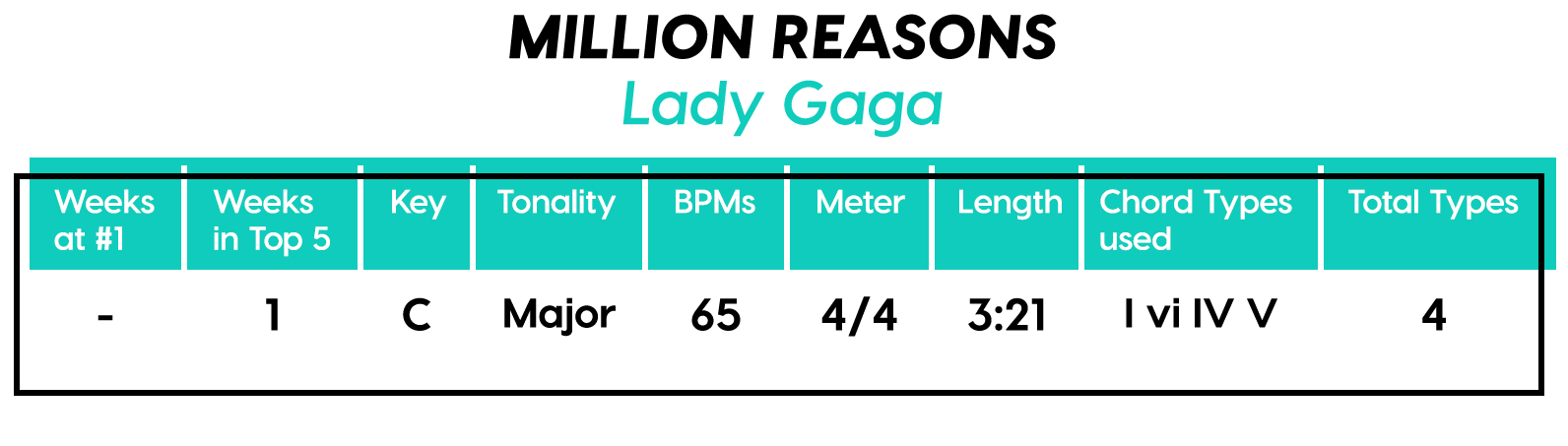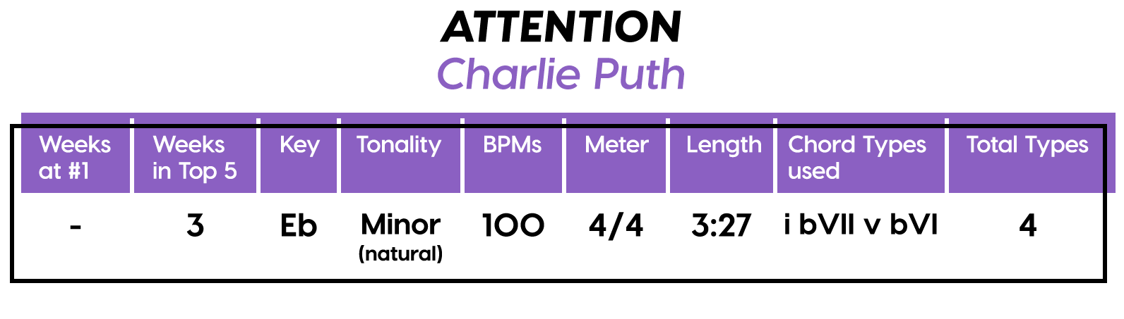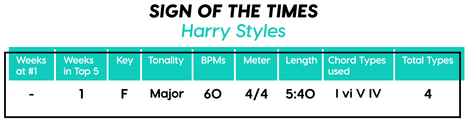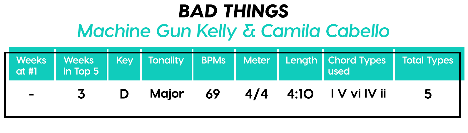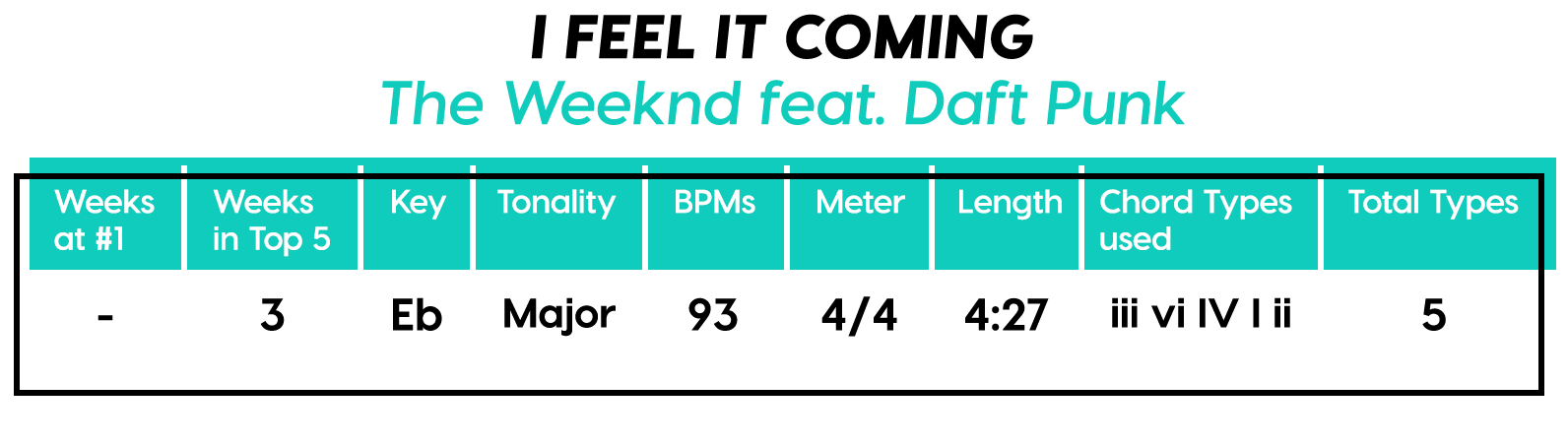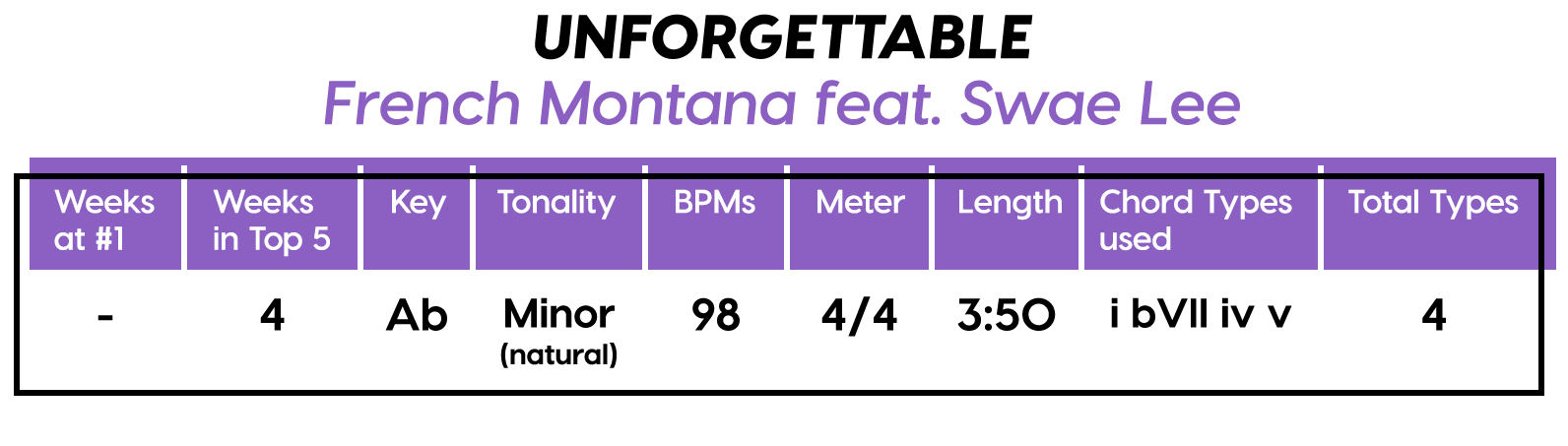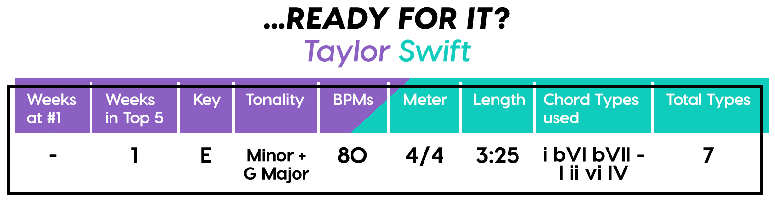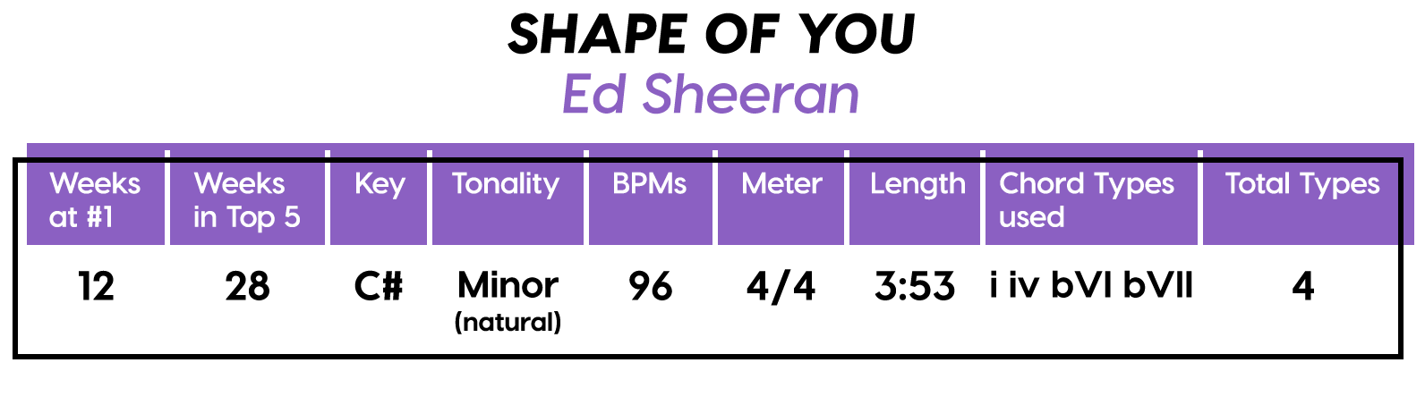 And the Diatonics Award goes to: “Thunder” by Imagine Dragons — all six (main) major diatonics! (we don’t talk about “vii°” anymore, not since he was tragically eaten by “V7”) Every Chorus is a little different, so that’s cool too. The Bridge is really an Instrumental, but I’m still calling it a Bridge because of the new harmonic material.