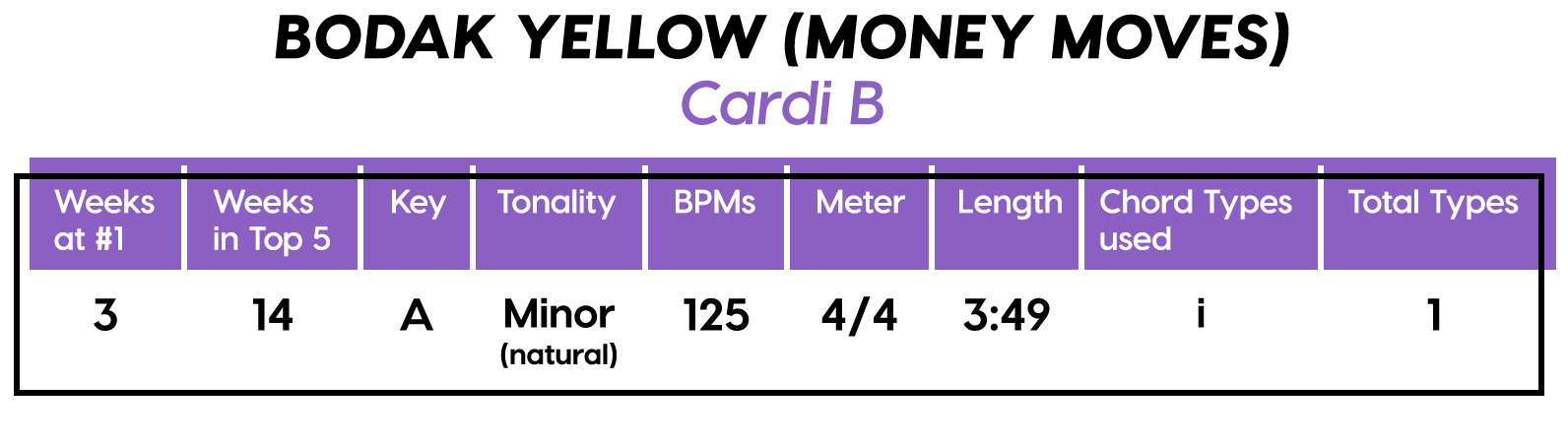What really strikes me about this one is Cardi’s rhythmic motif where she throws out two quick syllables, then leaves the rest of the count empty, for a bullet-like “d-da, d-da, d-da” attack. I heard this motif a lot this year, in more than a few songs on this list. Listen for it here and elsewhere, and if you want another treasure hunt, try to find the other song further down with an almost identical minor scale 2^♭3^ 5^ (“ti do mi”) motif.