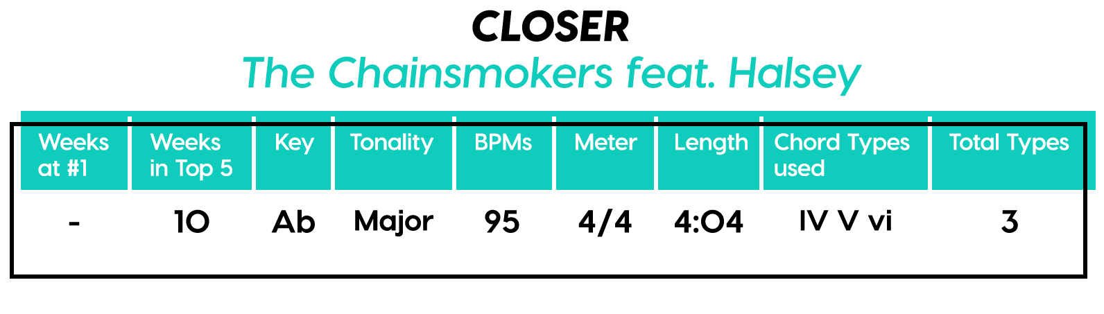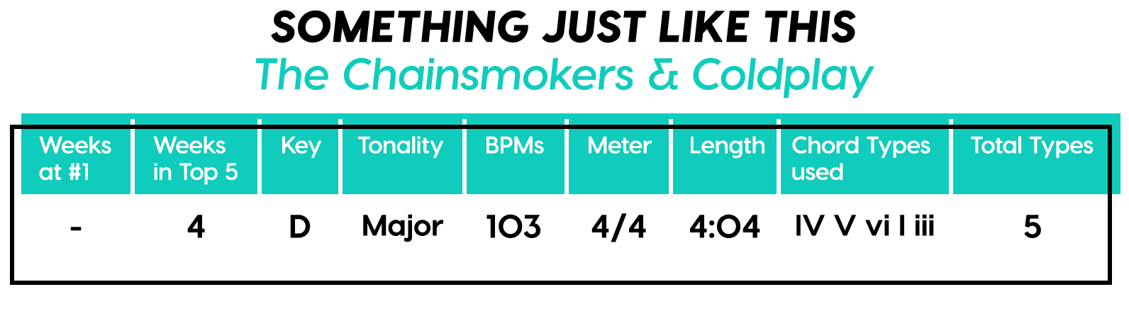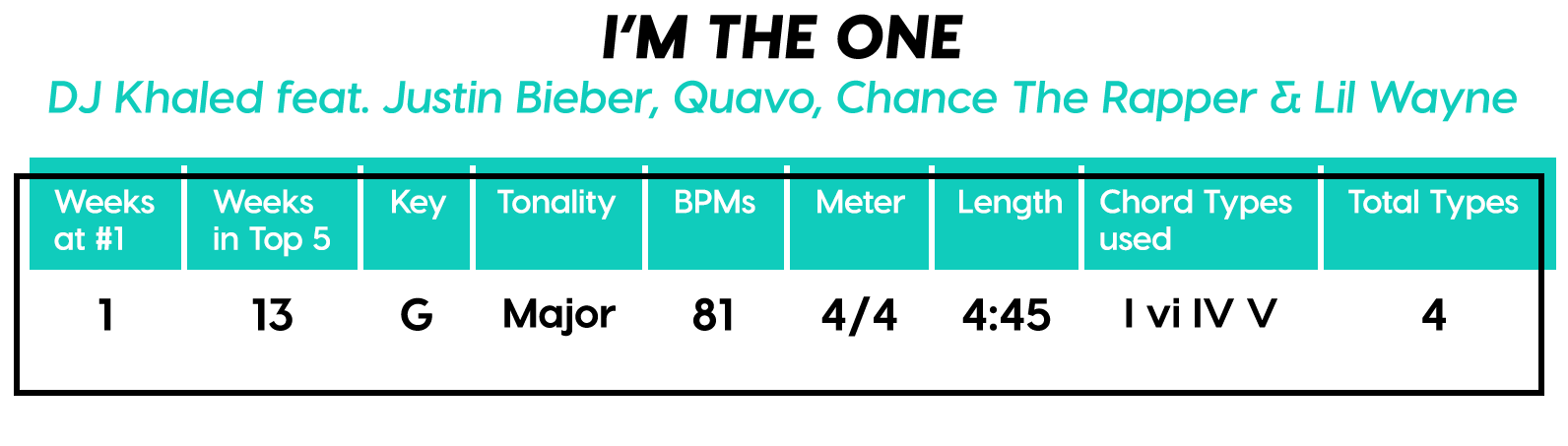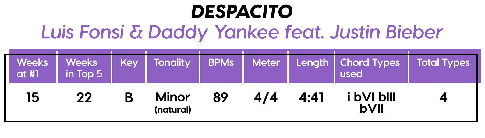 Let’s talk about the “shape” of the Chorus. You could semantically split it into both a Chorus and a Refrain if you wanted. I know you’ve heard it a million times, but listen again and decide for yourself. Also did you ever notice the half-measure break before the last Chorus? I love that trick, but unfortunately that’s not why this song topped the charts in basically every country with a radio station, (except for some reason Colombia). It even made it all the way up to #15 on the US Latino Pop chart! (Okay well that was the Latin remix, but still, who do you think gets those kush royalty checks in their mailbox?)