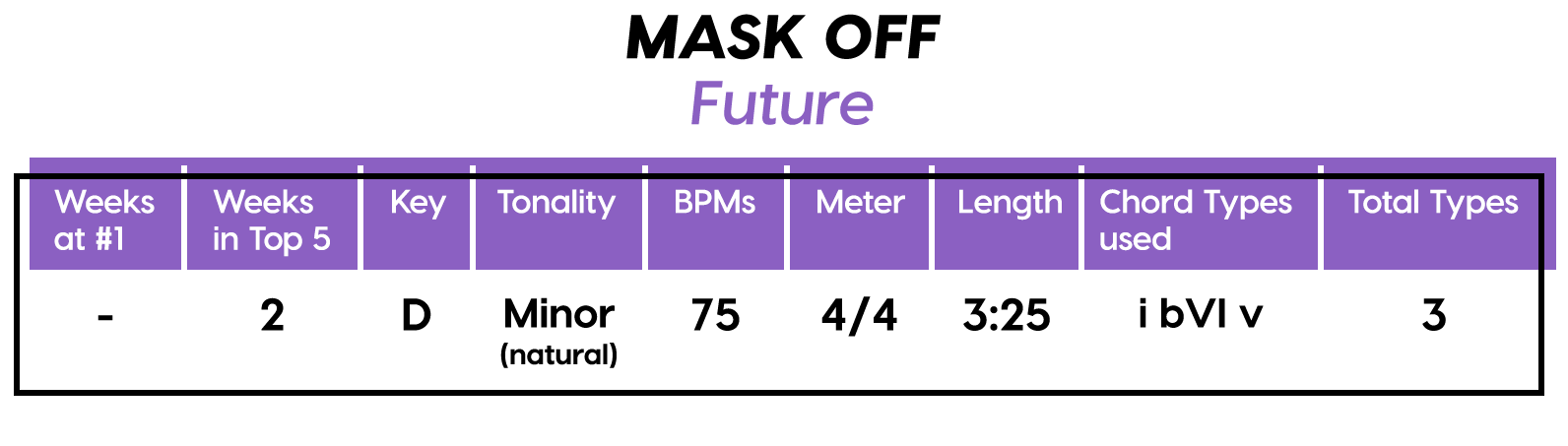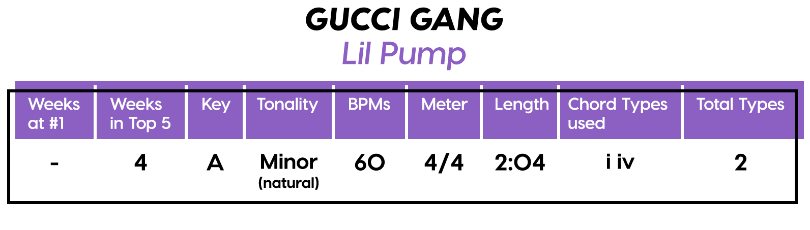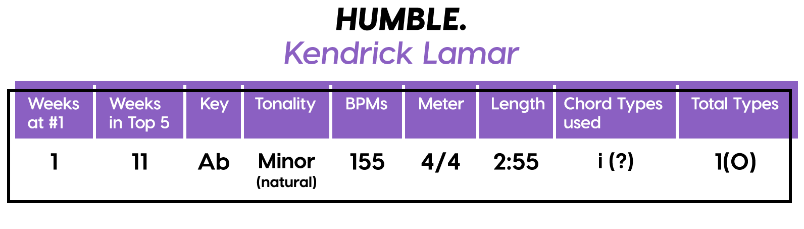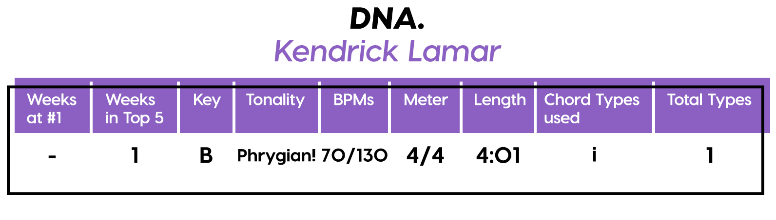 Like “Humble”, another of Lamar’s songs on this list, the key we’re in in “DNA.” is subjective because of a lack of concrete tonal information. I’m going with Phrygian this time instead of minor, because we’re camping on the Phrygian root twice as long. Formwise, this is pretty much free-verse over 4-bar chunks, there’s a part in the middle that repeats the opening phrase, which I’ll call the Bridge (just for the heck of it) as the beat changes to 130 BPM, leaving the music theory 101 solar system completely. This is some genius free-verse unbound s#*t. I could spend the rest of the day figuring out where to draw the lines here, but sometimes you just have to let it be and wait for the copycats to provide a little more context.