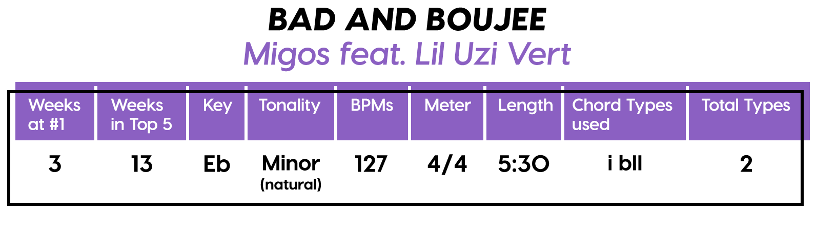 The E major sounding “do do mi re do” motif right before the first Verse heralds our uncommon “♭II” chord presence in the loop. I’m not 100% sure on the meter and tempo in this song either — you could feel this at 64 BPM just as well, if you don’t mind 32nd notes. Whatever the meter, that lyrical “d-da, d-da” motif is back in force for Lil Uzi Vert’s verse. I mean, you got to set yourself apart when you’re rapping with someone who’s had a whole rhythmic style named after him (google “Migos Flow”).