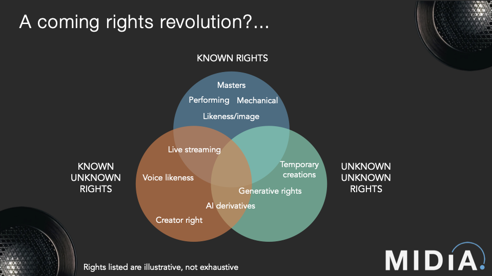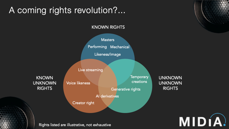 The known unknown rights are those we either already know we need or that there is the start of a conversation around (e.g., live streaming is hardly new, yet we still lack a global licensing solution). The unknown unknown rights are all the new possibilities merging technologies may throw up. Here are two key examples: