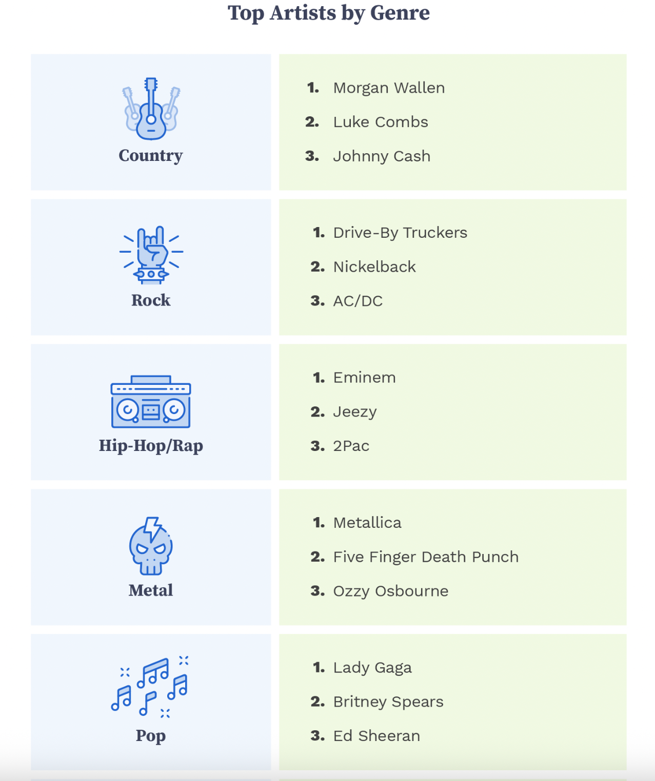 So, if you were picturing a cab full of Luke Combs and Merle Haggard, congratulations: the stereotype is basically intact. Those artists are still blasting through the speakers in many trucks, but the top playlisted artists in each genre do turn over every year or so.