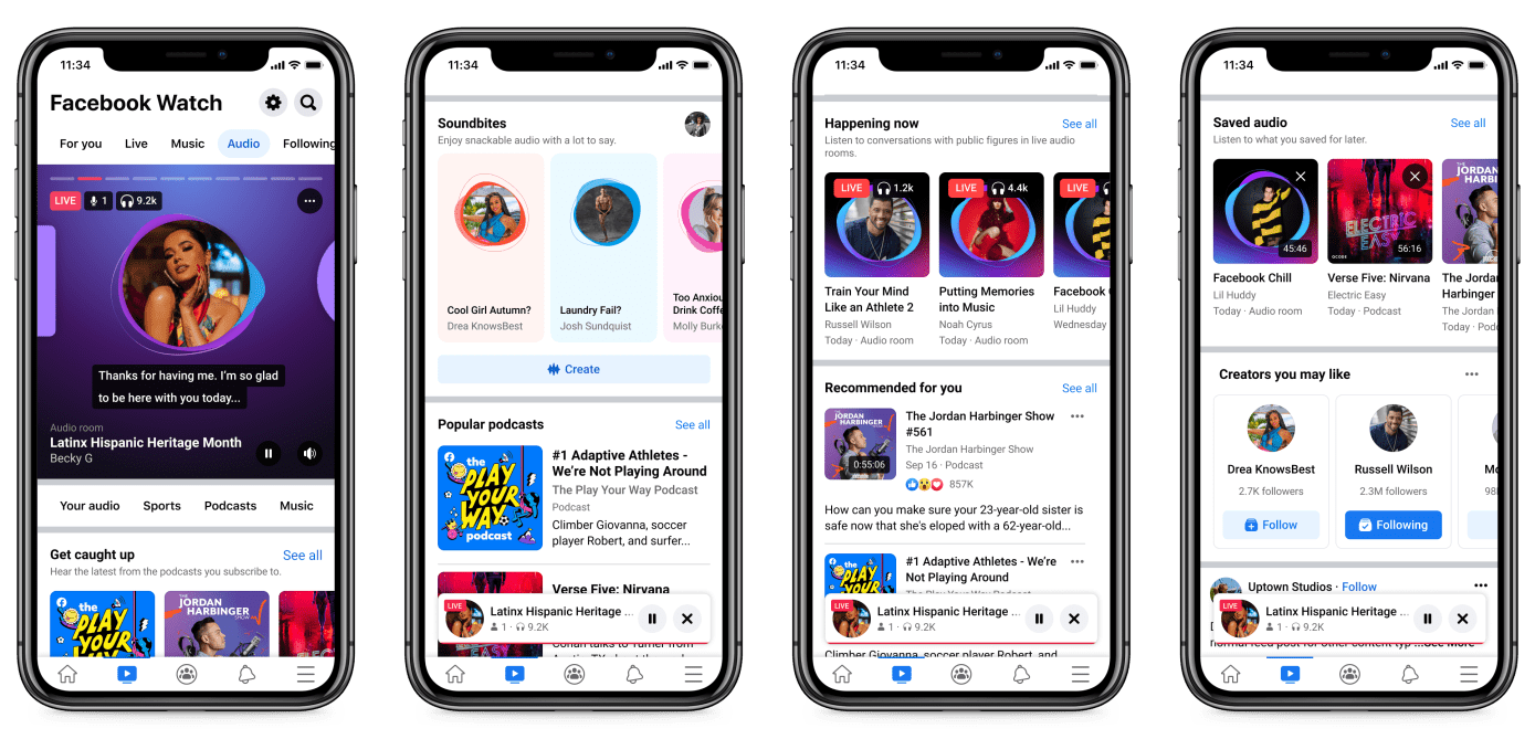 The new “Audio” destination in the Facebook mobile app in the U.S. brings together all of its audio formats including podcasts, its Clubhouse like Live Audio Rooms as well as ‘Soundbites’ offering short-form audio.