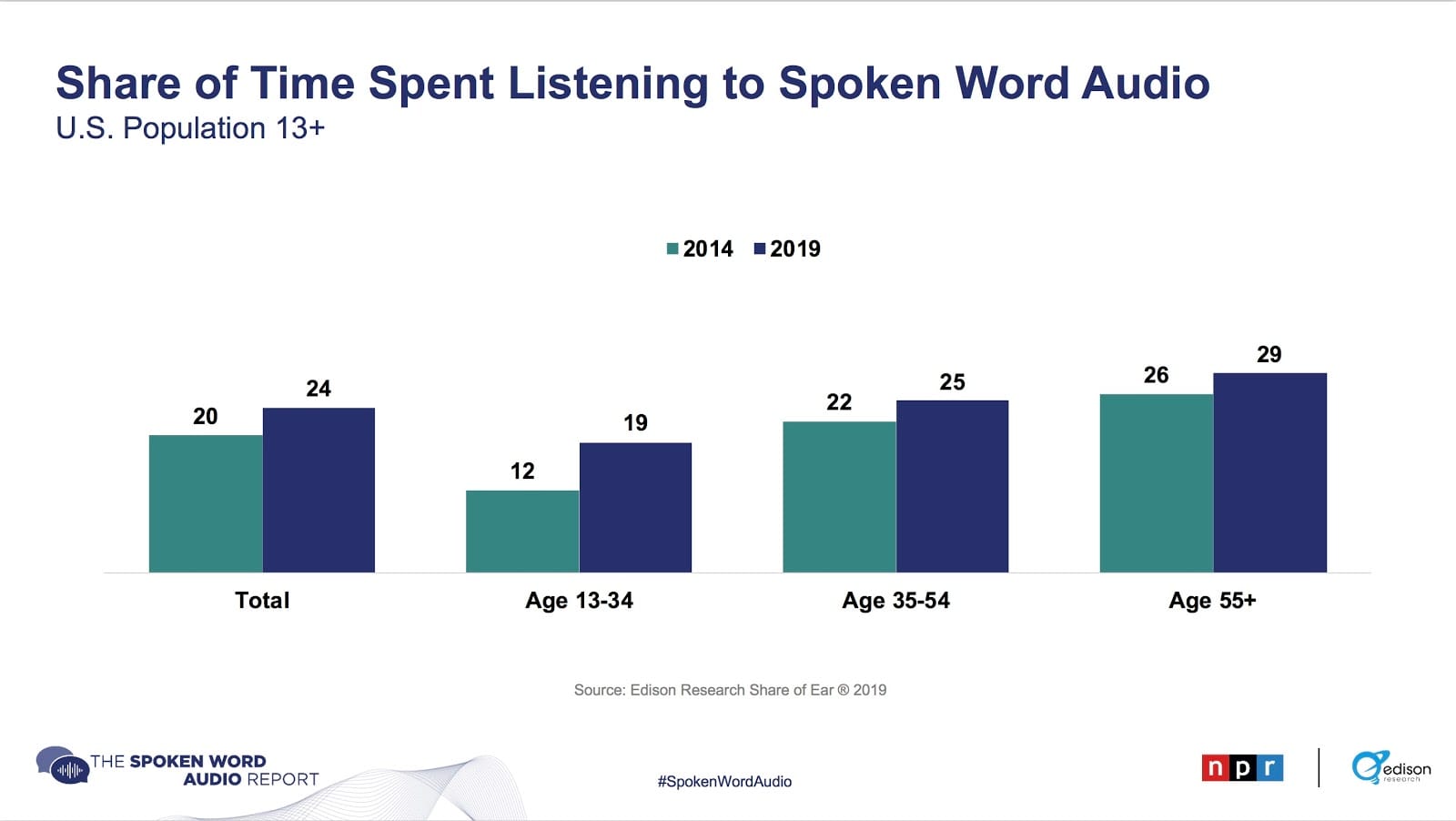 NPR’s “Share Of Ear” studies showed that in 2014, 80% of US listening hours were directed towards music and 20% dedicated to spoken word. In 2019, music fell to 76% and spoken word growing to 24%.