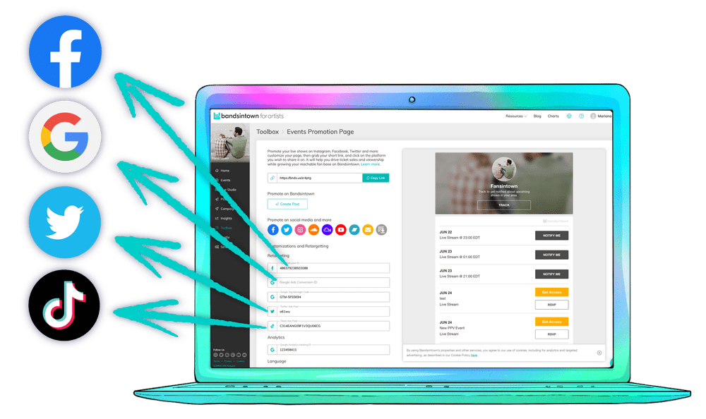 To keep the process as simple as possible, Bandsintown has embedded code for the most popular Tracking Pixels (Facebook/Instagram, Twitter, TikTok, and Google Ads) on each artist’s Events Promotion page.