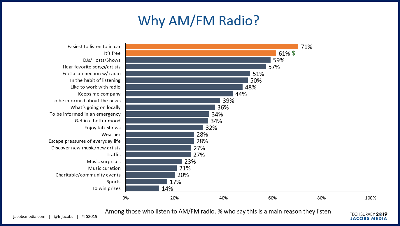 Guest post by Fred Jacobs of Jacobs Media StrategiesLast week, I started what will be a long series of Techsurvey 2019 presentations – first for its 500+ stakeholder stations, and then for a capacity crowd of attendees at the amazing WorldWide Radio Summit in Burbank. Keep in mind this is a web-based survey primarily among current radio listeners (and fans).With each passing year, those who witness what more than 50,000 respondents across North America have to say inevitably point to the crowded, disrupted media marketplace. And they wonder what keeps radio vital in an environment of burgeoning, cross-platform media content where consumers increasingly have more choice.It's a good question. The average consumer accesses information and entertainment across a vast array of gadgets (smartphones, smart speakers, Roku, etc.) as well as platforms (YouTube, podcasts, Twitch, etc.). So, what is it about radio that keeps them coming back, day after day, year after year?To address this question, we created a question series several years back we simply call “Why Radio?” We offer respondents a long list of potential benefits of listening to broadcast radio and ask them to tell us their main reasons for tuning in. Here's the chart across the entire sample – the percentage of people who say each is a main reason why they enjoy tuning in AM/FM radio.
