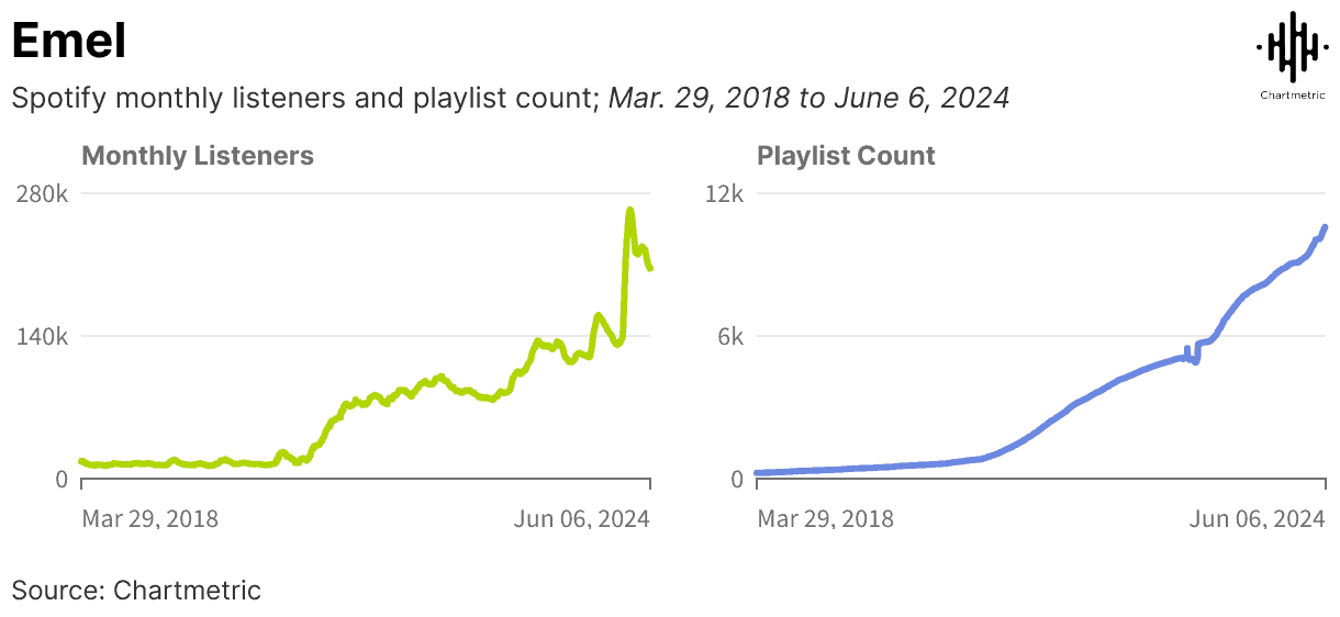 Emel’s monthly Spotify listeners have shown steady growth of roughly 1,550% over the last six years. Her surge in listenership aligns with her frequency of playlist inclusions, which has continuously climbed at a similar rate. Like the fellow artists on this list, Emel’s long-tail success highlights how savvy playlisting strategies can over time skyrocket an artist’s presence, capturing the attention of both curators and listeners alike.