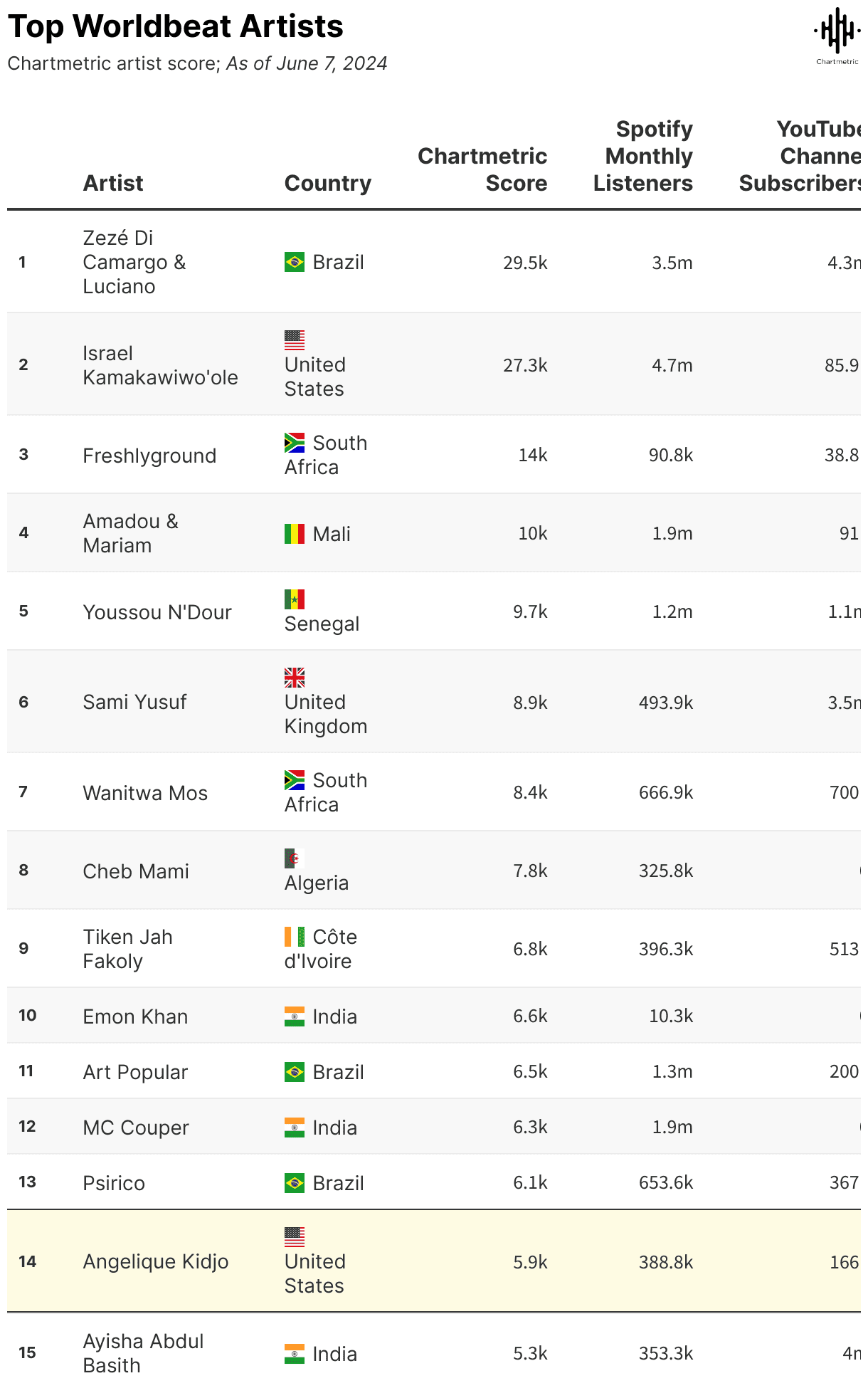Meanwhile, in West Africa, Beninois-French singer-songwriter Angélique Kidjo is also breaking into the mainstream. The Grammy-winning musician famously performed NPR’s 1,000th Tiny Desk Concert and has sung with the likes of Alicia Keys, Philip Glass and Peter Gabriel. Kidjo has been on the scene since the early 1990s and still holds Chartmetric’s No. 14 spot for worldbeats.