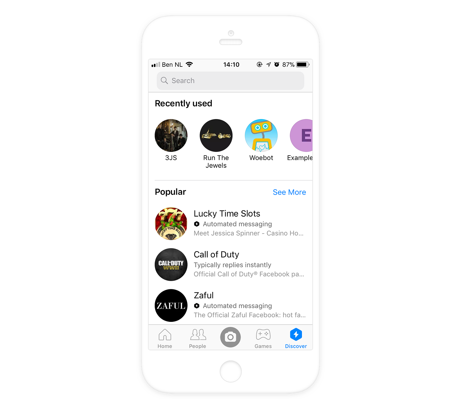 Facebook explains in detail: “The Discover tab is where people can browse and search for Messenger bots, as well as nearby places and businesses to message. Results in the Discover tab are personalized to each person, and organized by category, recent activity and featured experiences.” Basically, it’s a great way to gain some visibility for your bot.