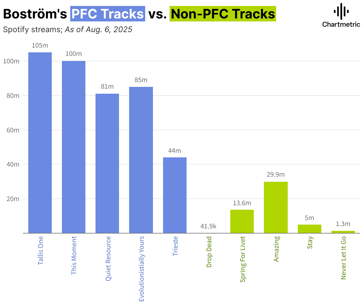 In terms of reach, PFC has been a boon to Boström. Even though he has written and played on some bona fide hit songs, even his Eurovision final entry lacks the streaming impact of his PFC music. In 2012, Boström co-wrote Norway’s Eurovision entry, “Stay” by Tooji, which made it all the way to the grand final — before finishing in last place with seven votes. “Stay” has racked up more than five million plays on Spotify, but each of the aliases that Bostrom promotes on Catfish Music has a song with more plays than this.
