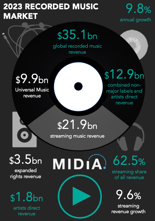 The recorded music market is becoming more diversified, and although streaming is still the centre piece, its role is lessening. Streaming revenues hit $21.9 billion in 2023, up a relatively modest 9.6% on 2022. For the first time ever, streaming grew slower than the total market, to the extent that its share of total revenues actually fell (to 62.5%). Interestingly, over the same period, the five publicly traded DSPs grew revenue by 15.9%, and Warner and Sony collectively grew music publishing streaming revenue by 18.4%. Value is beginning to shift across the streaming value chain.