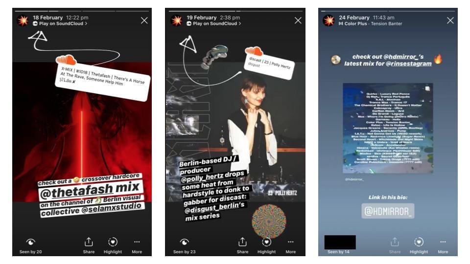 - Share a picture from the promoter or venue’s Instagram timeline. This helps connect the community to people active in the scene, and it also sends a notification to the account holder and allows them to repost the story to their own stories (in turn giving @harddanceberlin more exposure).