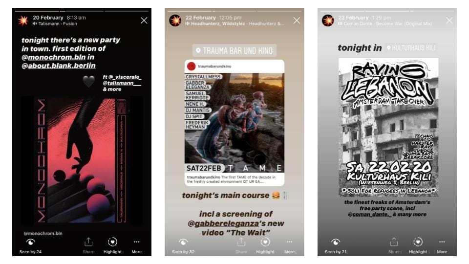 The above screenshots also indicate how it only takes me a few minutes per day: for story 1, the artwork was sent to me by the promoter. For story 2, I just reposted one of the promoters’ announcements. For story 3, I made a screenshot of the Resident Advisor calendar I maintain and cropped out irrelevant stuff.