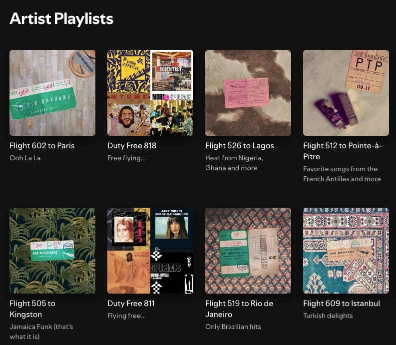 Examples: Playlists created by individual users, influencers, tastemakers, or artists like Khruangbin’s playlists from around the world, *JBREKKIE PLAYLIST* by Michelle Zauner of Japanese Breakfast, and Homemade Dynamite by Lorde.