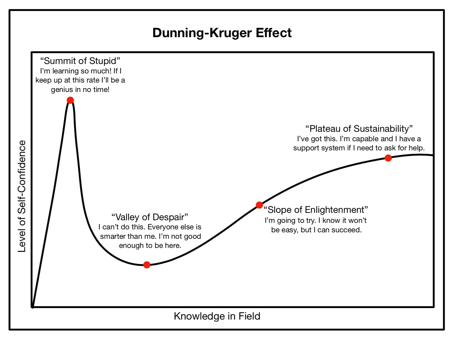 The Dunning-Kruger Effect is the best representation I’ve found to conceptualize the progression that most people follow during their careers. As you can see, it’s not a linear road to travel, even in its most simplified form.