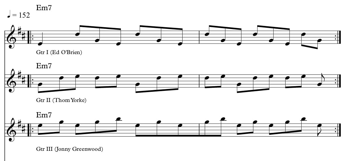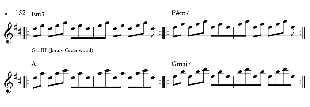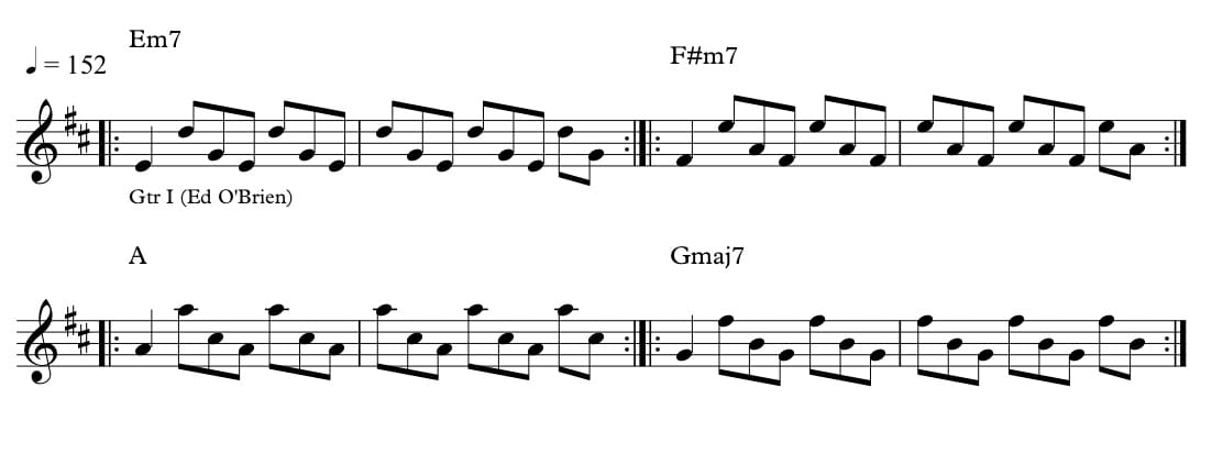 The first guitar arpeggio (the plural of which gives the song its title) is played by Ed O’Brien and it follows as such (written an octave higher than played):
