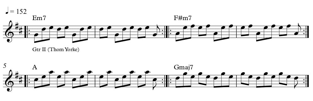On the fourth chord in the progression, Gmaj7, a second guitar (in live versions, this is played by Thom Yorke) superimposes another arpeggio onto the one we just heard. The overall harmony results in a G6maj7. This is a possible transcription of this new arpeggio: