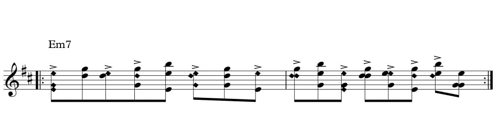 The guitar lays out the harmony of the first part of the song, and it’s playing two shell voicings — root, third, and seventh — of the chords Em7 and F#m7. It then develops into A and Gmaj 7, again in the form of a shell voicing.