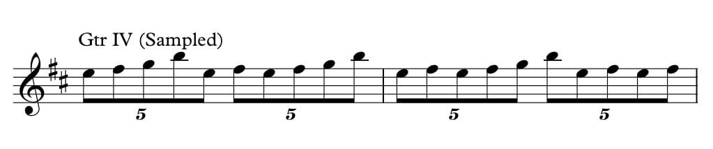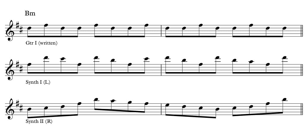 This second, complementary arpeggio is basically an inversion of the chords played by Gtr I, but with the accents being shifted in a different way (more on this later).