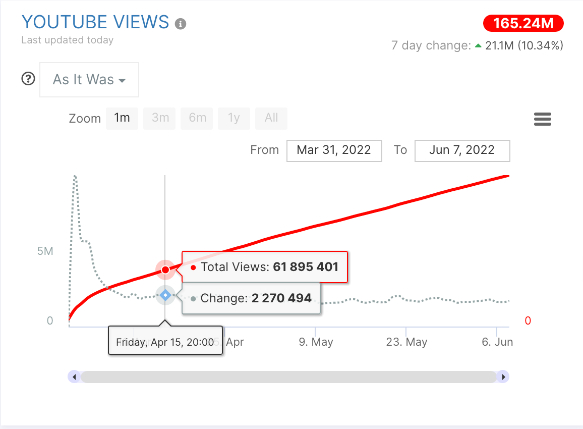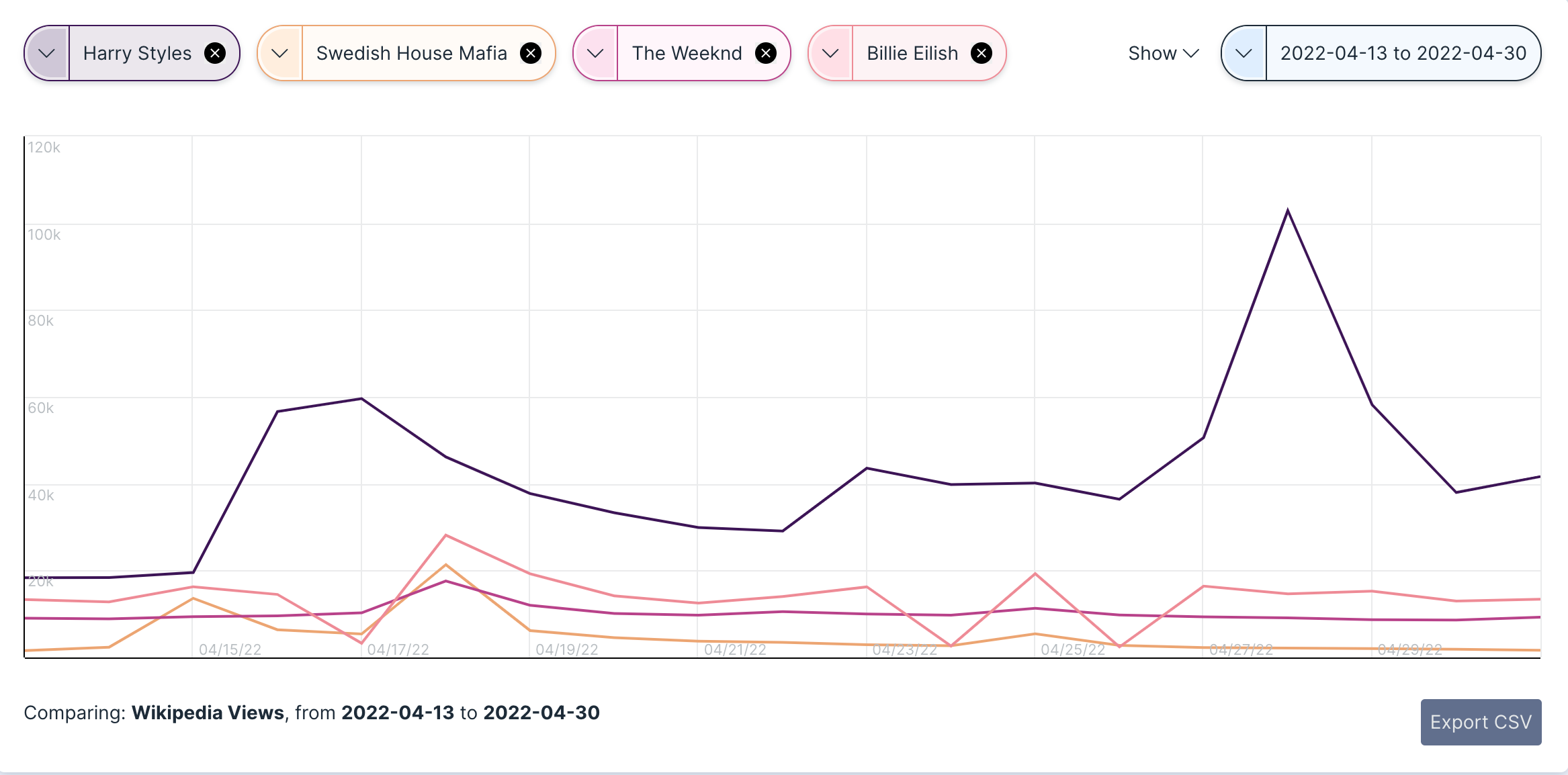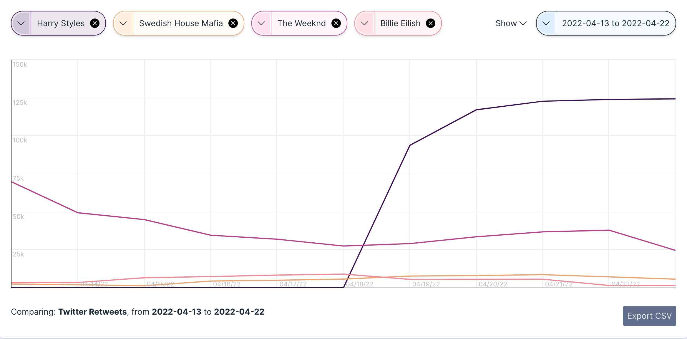 While other headlining acts such as Billie Eilish, Swedish House Mafia, and The Weeknd undoubtedly put on stellar performances, the growth trends across Styles’ platforms certainly spoke for themselves. As we discovered with our recent investigation into the social and streaming growth of Coachella artists in 2022, Harry had increased his monthly Spotify Monthly Listeners from 45M to 65M+ (82%). In terms of Twitter retweets, the icon found himself receiving 100K+ per day during the second weekend of the festival. Even Wikipedia showed evidence of new fan engagement, as his page gained 720K+ views in just 15 days.