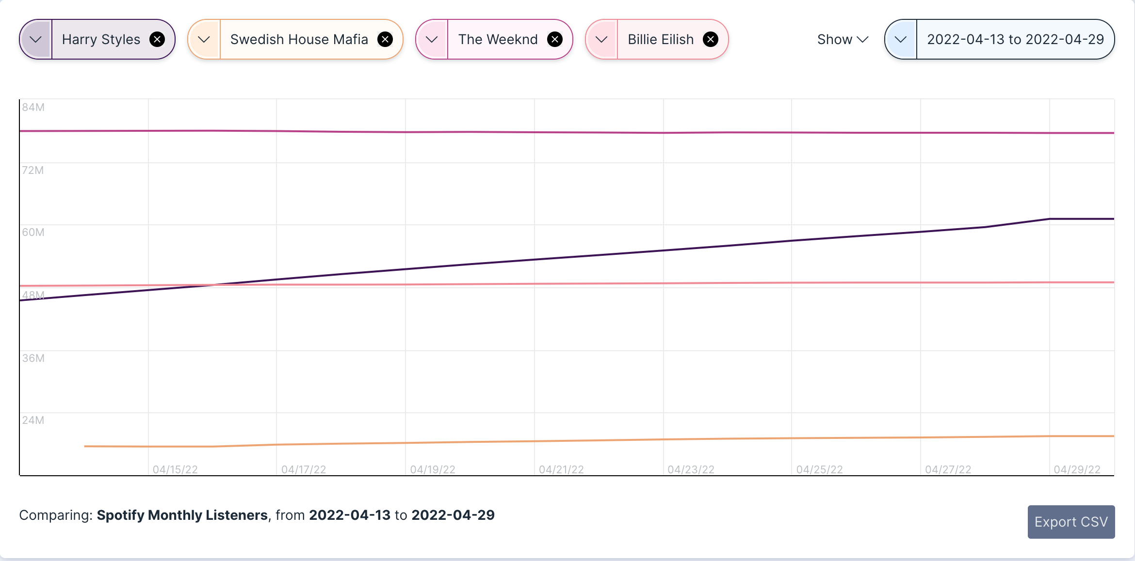 Today, the impressively successful icon has not only released his third, chart-topping studio album Harry’s House, but he’s also headlined one of the largest music gatherings in the world: Coachella. Whether or not you’re a fan of this teen-idol gone Pop star, there’s no denying the impressiveness of his rise. Follow along as we use Chartmetric to dive deep into just how exciting these past few months have been, and how Mr. Styles’ post-Coachella data compares to his past releases.